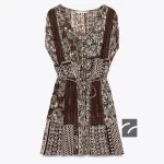 V yaka, kolsuz, boncuklu elbise. Lastikli bel ve ince kemerli. Metalik iplikli desenli kumaş. İç astarı mevcut.