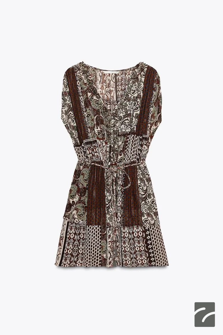 پیراهن بدون آستین و با سنگدوزی V یقه. دارای کمر کشی و کمربند نازک. پارچه با طرح نخ فلزی. دارای آستر داخلی.