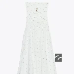 پیراهن یقه گرد با بافت مشبک الاستیک و شانههای افتاده. دارای جزئیات رنگارنگ، پومپومهای ترکیبی و گلدوزی.