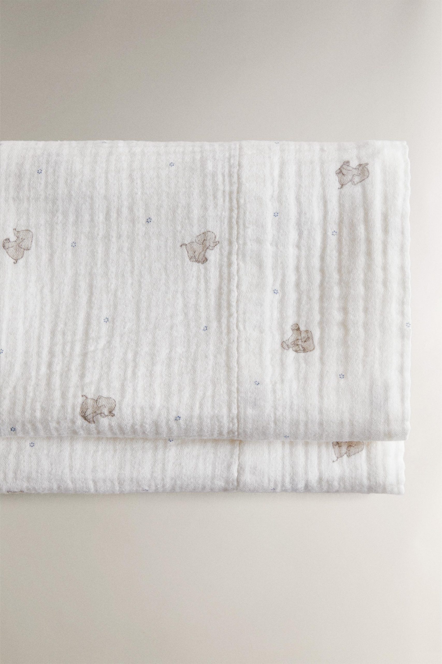 Pamuklu muslin kumaştan üretilmiş, fil desenli, yastık kılıfı ve üst çarşaf içeren bebek mini beşik takımı.