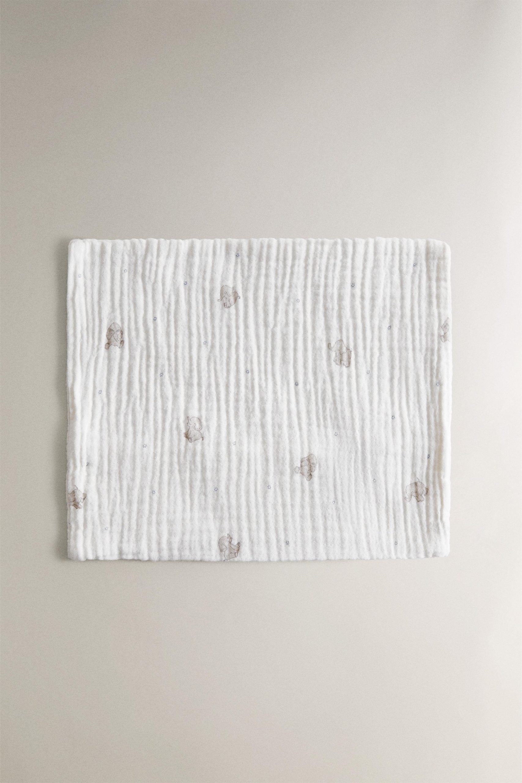 - Pamuklu muslin kumaştan üretilmiş, fil desenli, yastık kılıfı ve üst çarşaf içeren bebek mini beşik takımı.