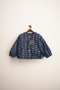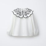 - Nakışlı bebe yakalı, uzun kollu ve lastikli manşetli t-shirt. Sırtı düğmeli ve damla şeklinde açıklık detaylı.