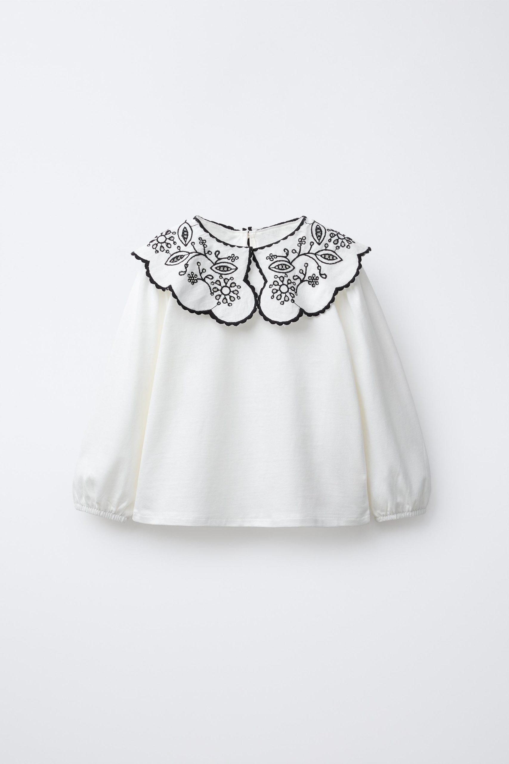 Nakışlı bebe yakalı, uzun kollu ve lastikli manşetli t-shirt. Sırtı düğmeli ve damla şeklinde açıklık detaylı.