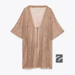 Metalik iplikli, yarı transparan, kısa kollu bluz. Boncuk aplikeli nakış detaylı. Önden bağcıklı.