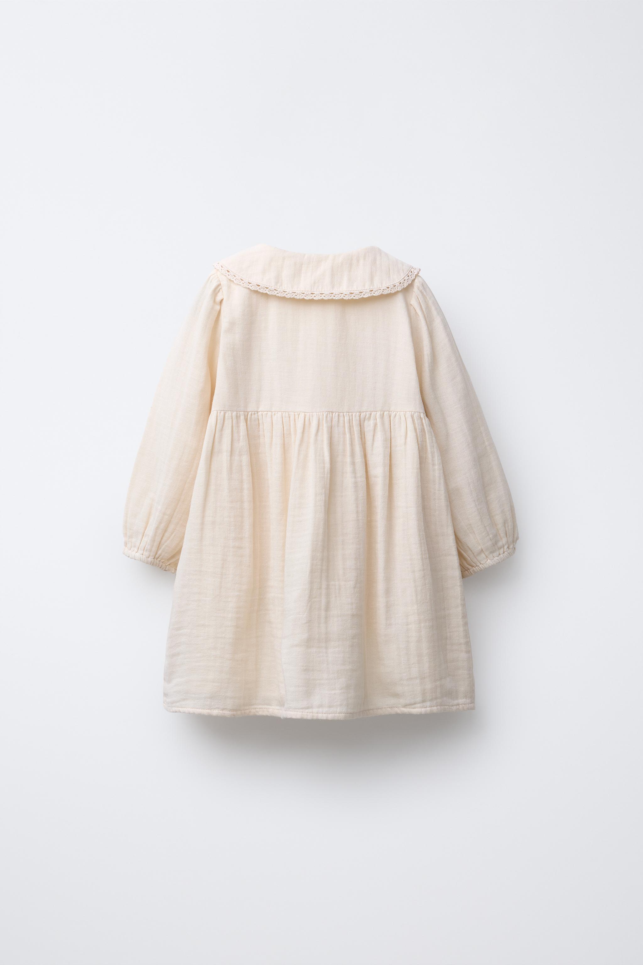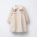 - Bebe yakalı ve lastikli uzun kollu elbise. Önden düğme kapamalı. Ön kısmında çiçek nakışlı detay ve dantel detayları. İç astarı aynı tonda kombine edilmiştir.