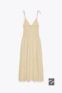 پیراهن کوتاه آستینکوتاه با یقهی بیزیکلت و دکمههای جلو. دارای جزئیات گلدوزی شده در انتهای دامن.