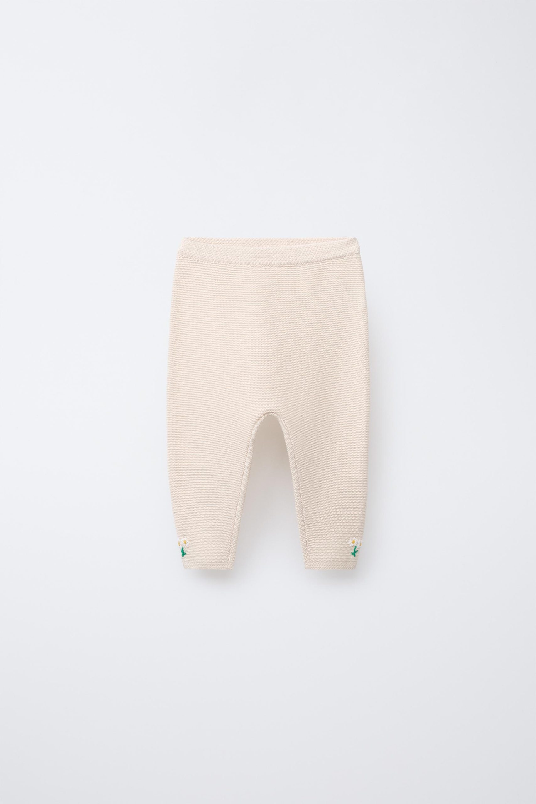 Elastik belli, örgü pantolon. Etek ucunda nakışlı çiçek detayı.
