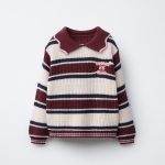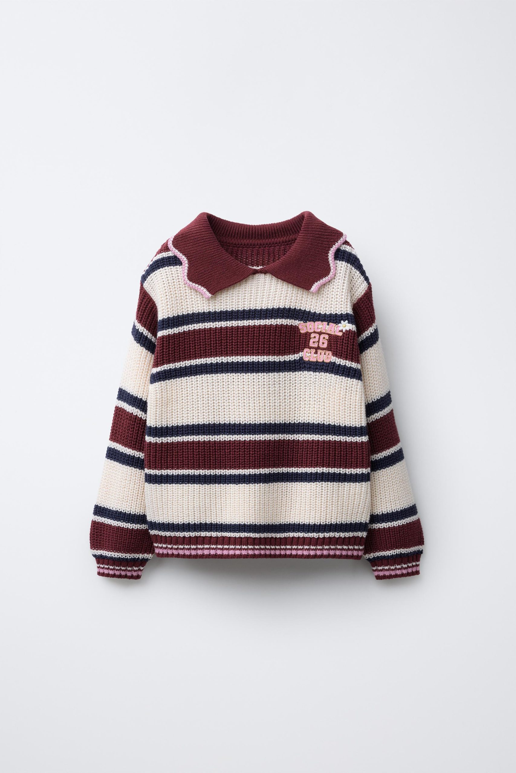 - Polo yakalı ve uzun kollu triko kazak. Çizgi desenli ve göğüs kısmında nakış detaylı.