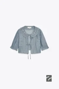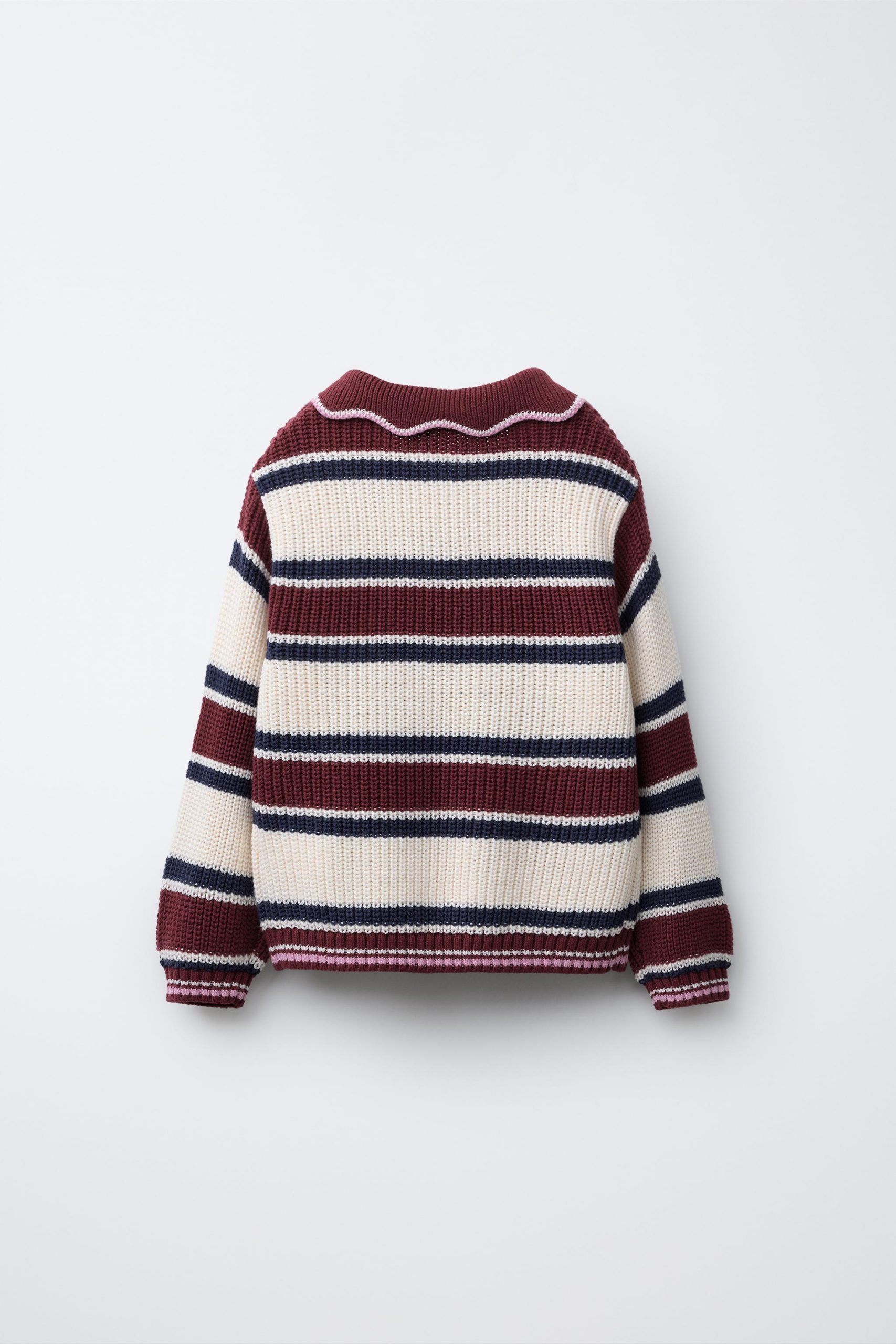 پولوی یقهدار و آستینبلند بافتنی. دارای طرح خطی و جزئیات گلدوزی در ناحیه سینه.