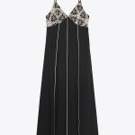 پیراهن میدی با یقه V و بندهای نازک. دارای نوار برجسته و جزئیات گلدوزی شده در رنگهای متضاد.