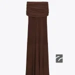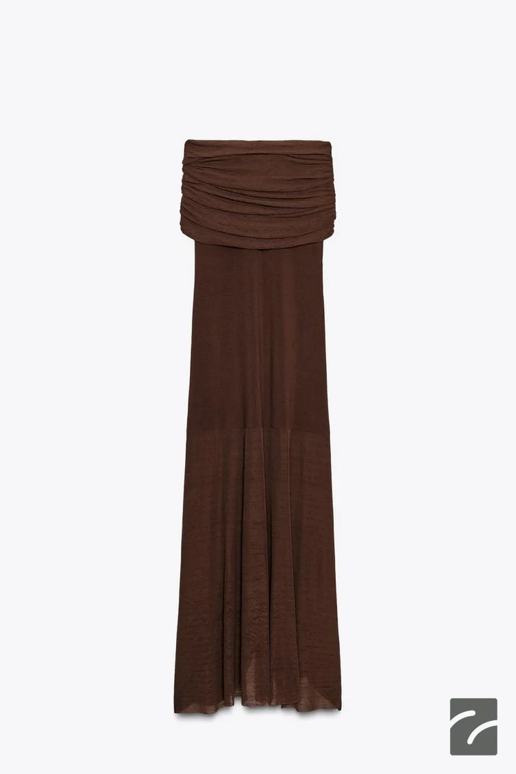 Düz yakalı, düşük omuzlu, büzgülü kısa kollu, kıvrımlı bitişli elbise. Eteği yarı transparan kumaşla kombinlenmiştir.
