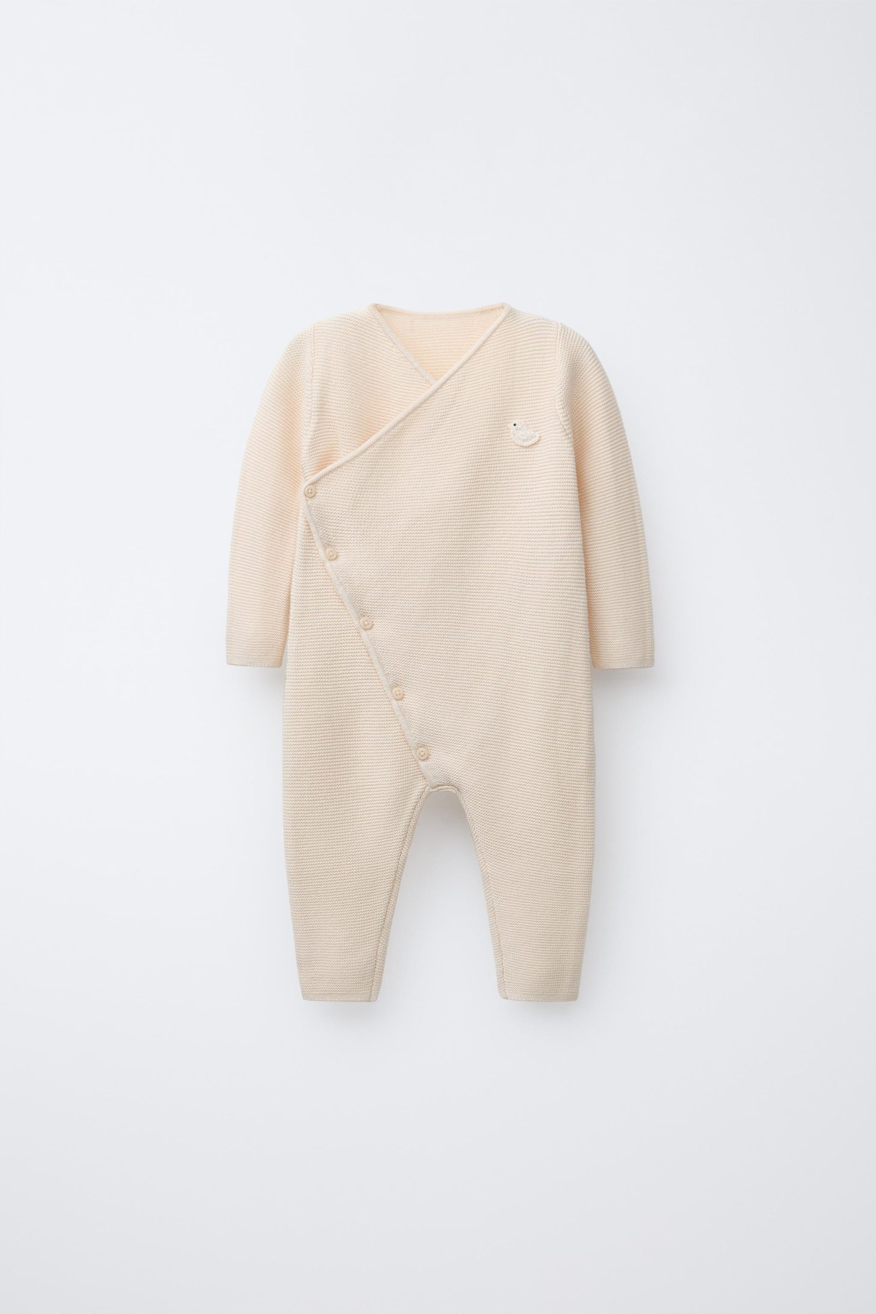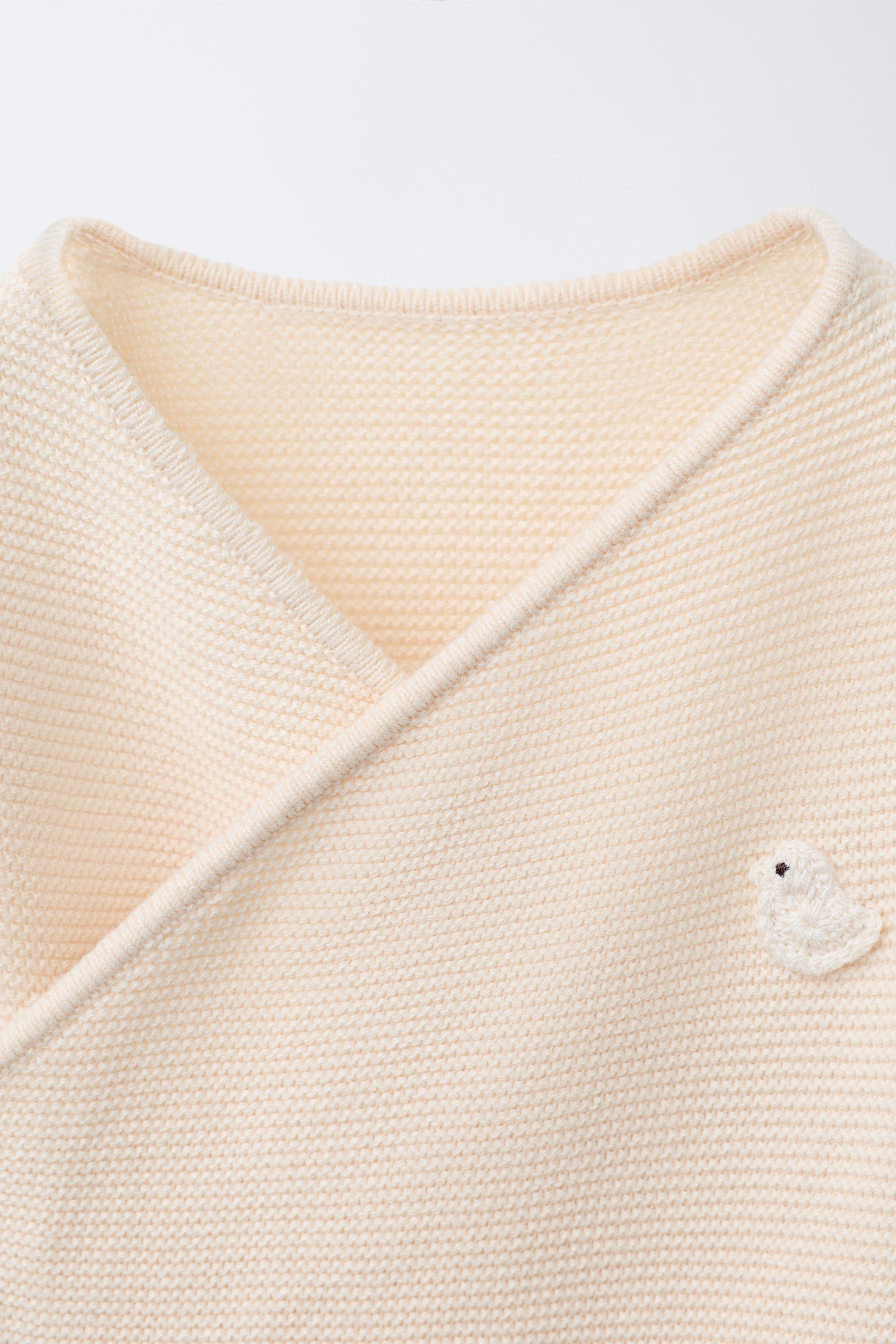 V yaka ve uzun kollu, örgü kimono. Önden düğmeli, kruvaze kapamalı. Göğüs kısmında ördek şeklinde yama aplikeli.