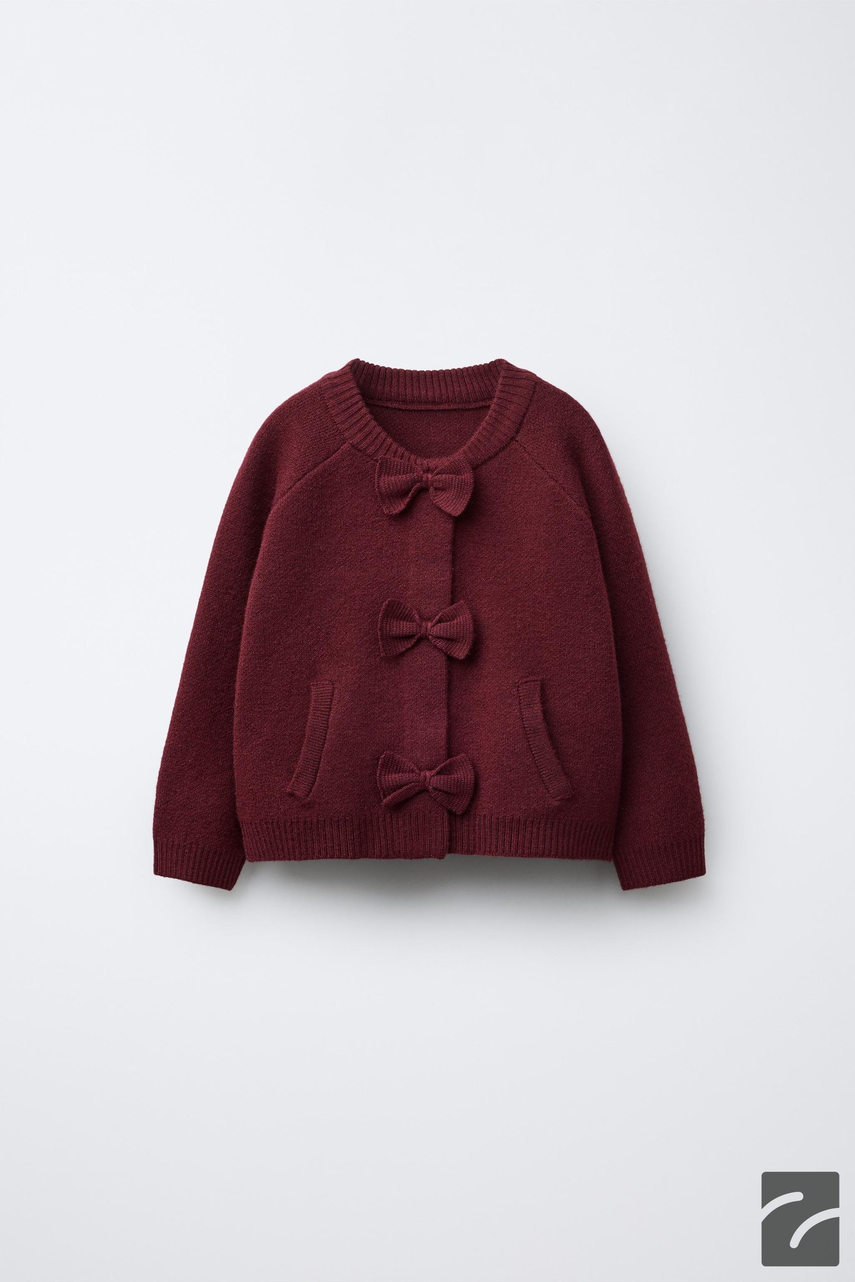 ژاکت بمبری با یقه بیسیکلت، آستین بلند و بافتنی. دارای جزئیات اپلیک فیکون و دکمههای مخفی چسبان. جیب جلو با جزئیات نوار دوزی شده.