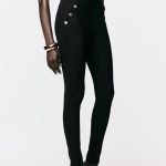 تایت با کمر بلند و الاستیک. دارای دکمههای فلزی برجسته و جیب.