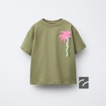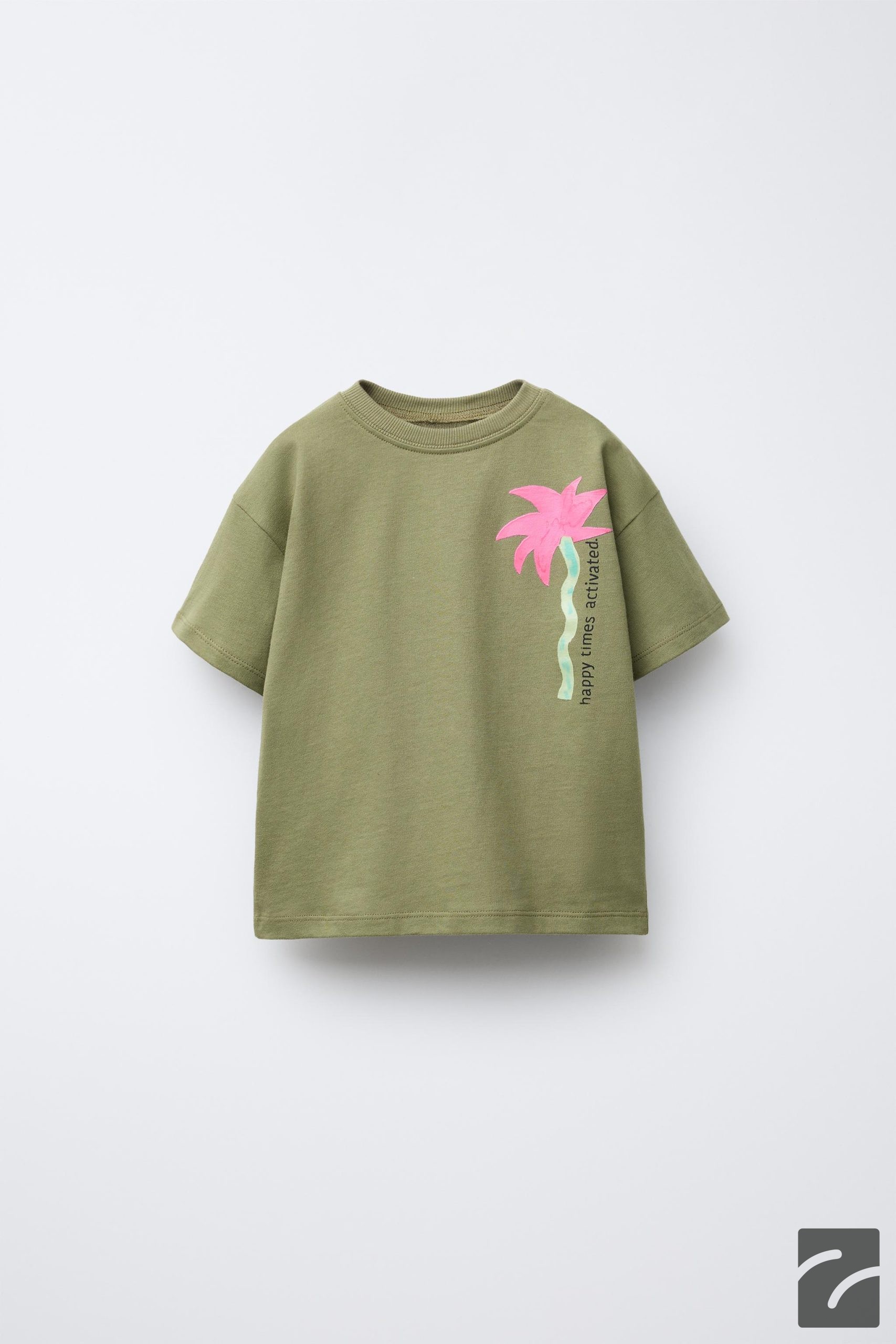 Bisiklet yaka, kısa kollu t-shirt. Ön ve arka kısmı palmiye ağacı baskılı. %100 pamuklu kumaş.