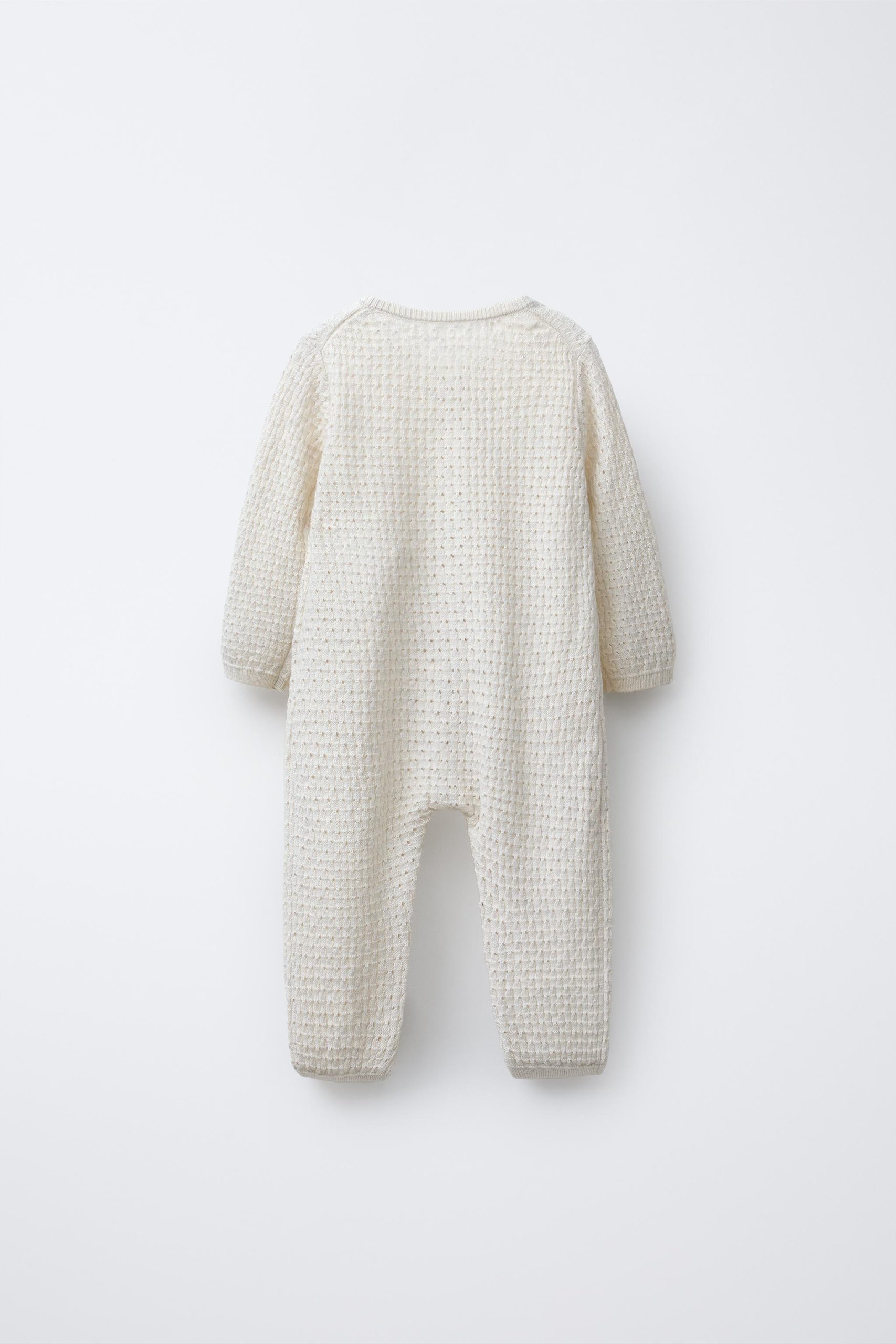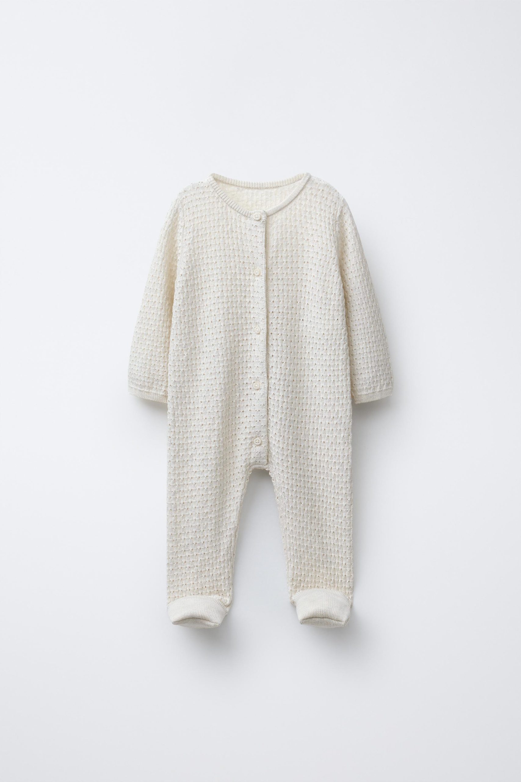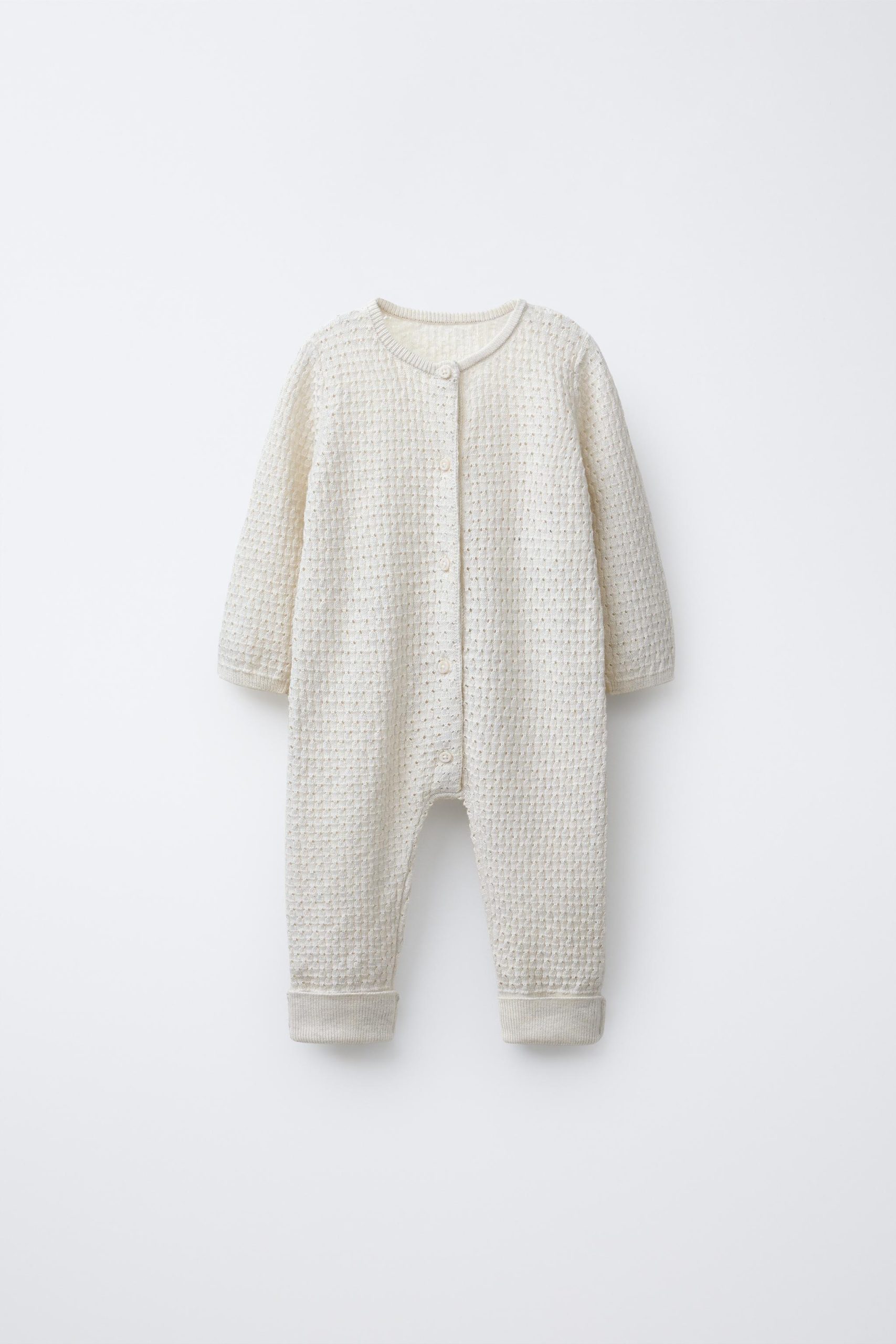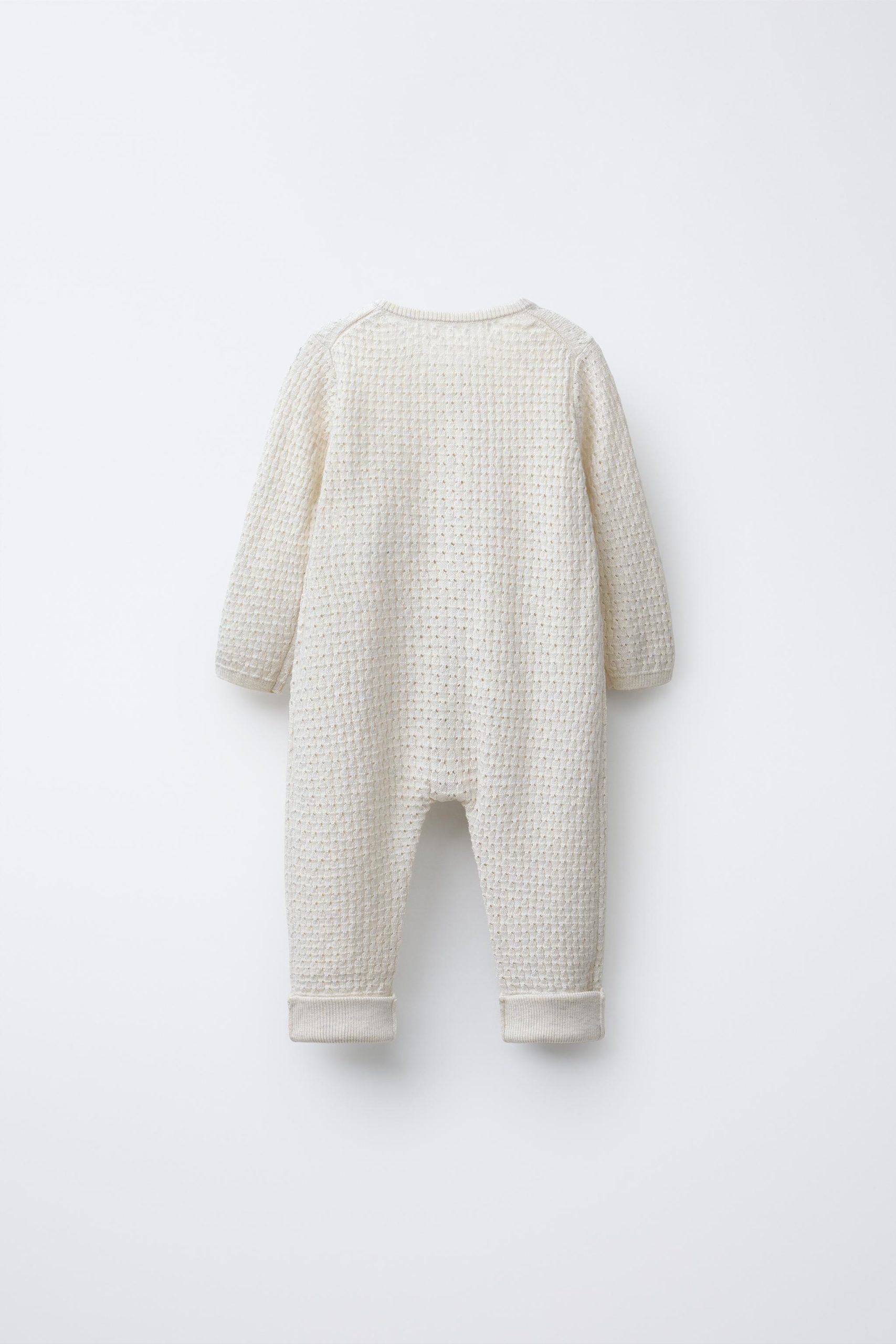 Bisiklet yaka, uzun kollu tulum. Paçası manşetli, ayarlanabilir uzunlukta ve çorap olarak da kullanılabilen kapalı tulum. Önü düğmeli. Kumaşı %70 pamuk, %15 ipek ve %14 kaşmir içerir.
