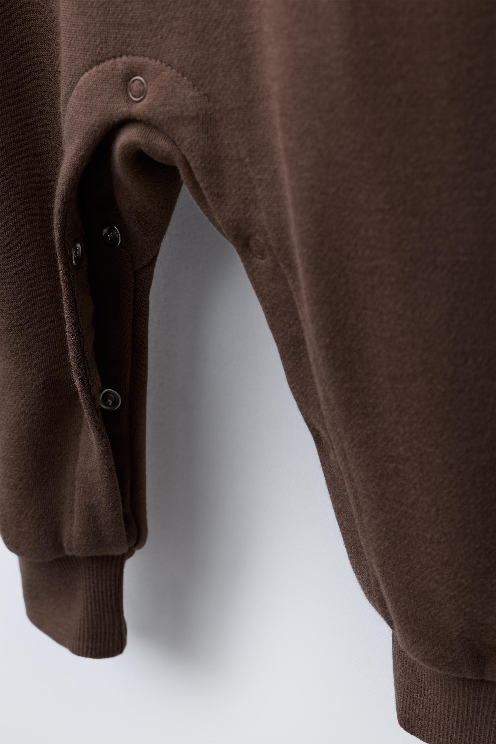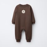 • Bisiklet yaka, manşetli uzun kollu, omuzdan ve paçadan çıtçıt düğmeli, paçaları manşetli, önü ayıcık nakışlı, %68 pamuklu tulum.