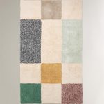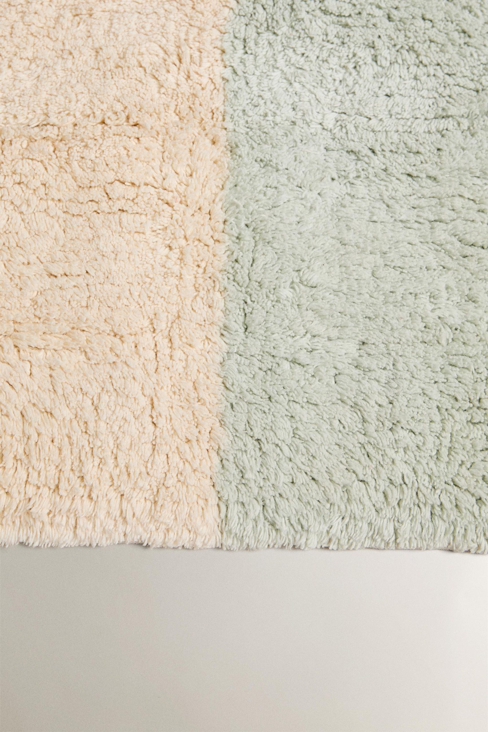 - Pamuklu dikdörtgen çocuk kilimi, tufting tekniğiyle kabartmalı bir yüzeye sahip, kırkyama desenli. Nemli beyaz bir bezle temizlenmesi ve havada kurumaya bırakılması tavsiye edilir.