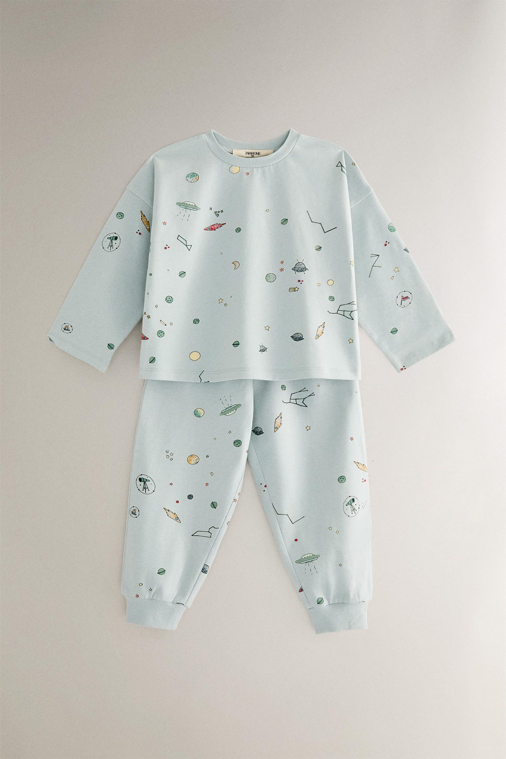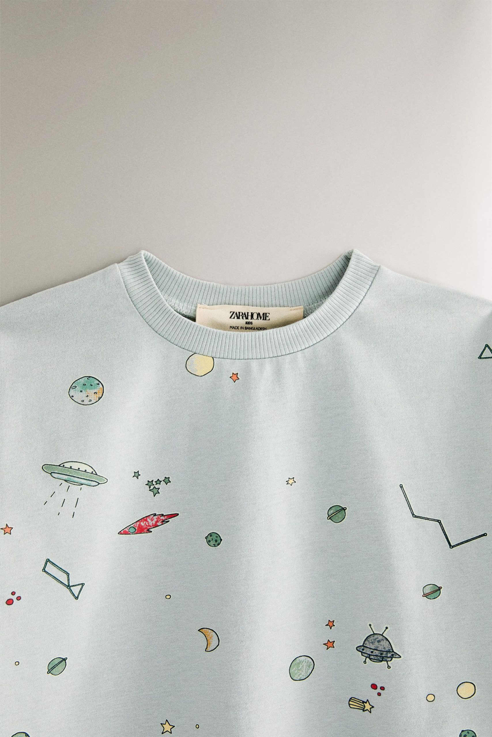 Uzun kollu, bisiklet yaka üst ve uzun pantolon içeren, pamuklu çocuk pijama takımı. Uzay temalı desenlere ve karanlıkta parlayan detaylara sahiptir.