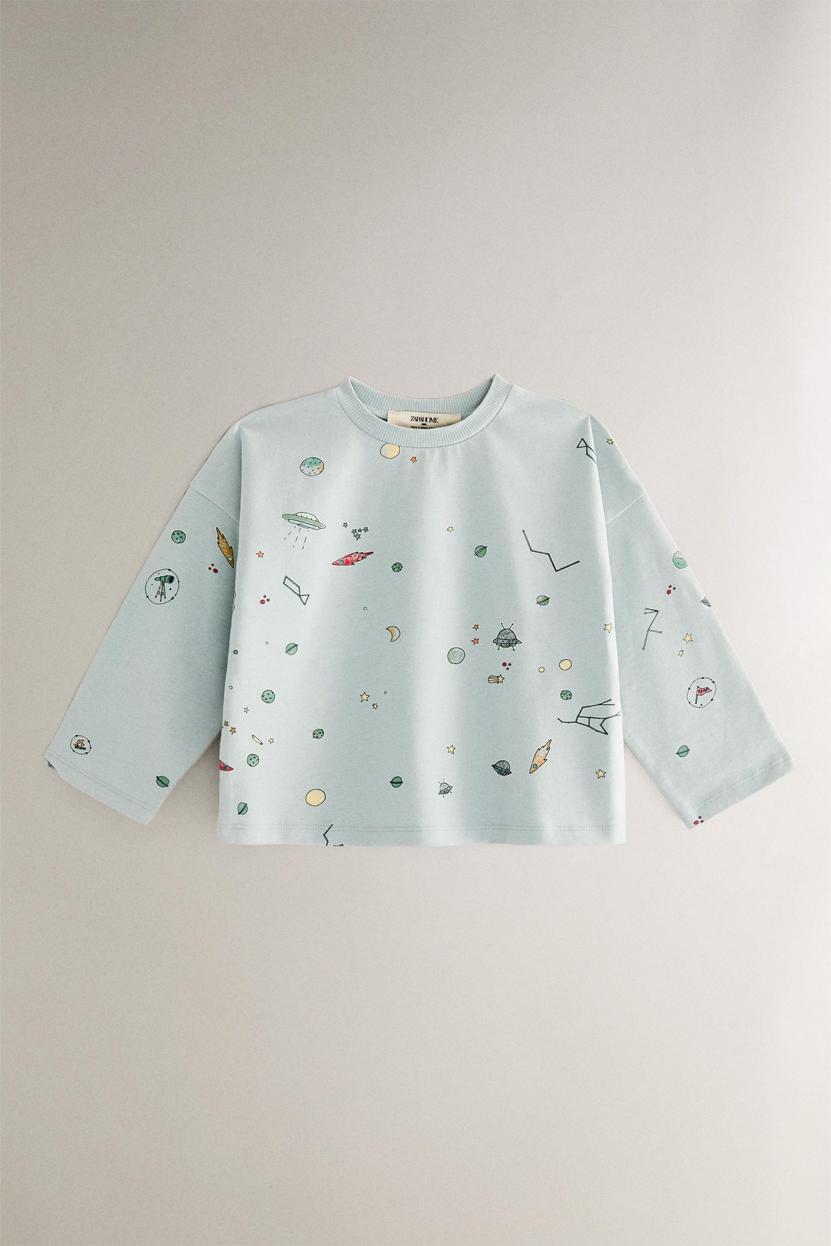 ست پیژامه کودکانه شامل بلوز آستین بلند با یقه گرد و شلوار بلند از جنس پنبه است. این ست دارای طرحهای با تم فضایی و جزئیات درخشان در تاریکی میباشد.