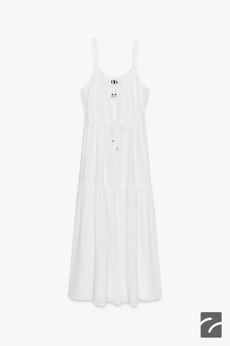پیراهن یقه گرد با بندهای عریض و تزئینات مرواریدی. دارای کمر جمعشونده و قابل تنظیم. این پیراهن دارای آستر داخلی کوتاه است.