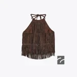 Boyundan bağlamalı halter top ve açık sırt. Boncuk detaylı püsküller. Arkası lastikli. Yan dikişte gizli fermuarlı.