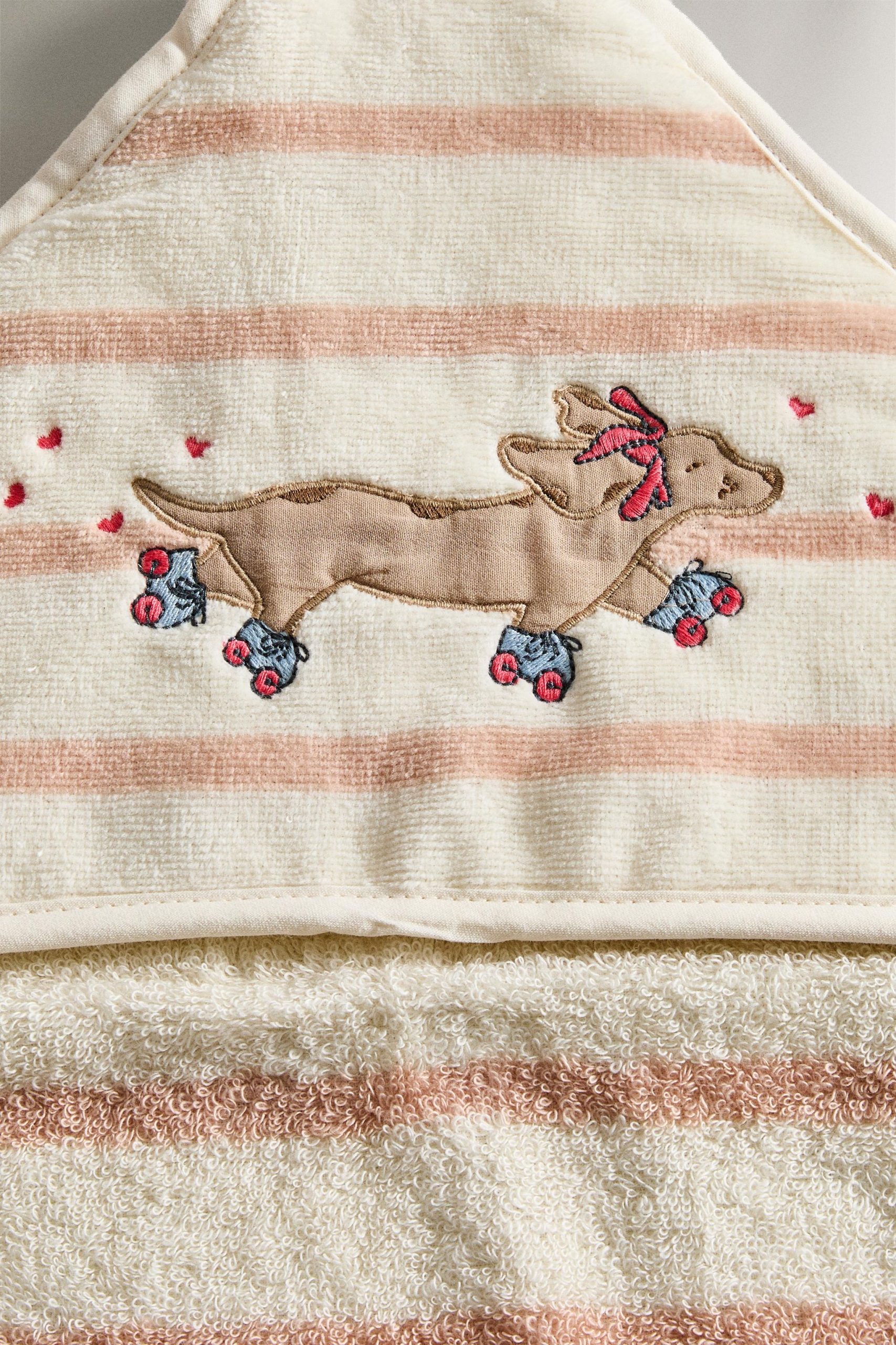 Velur pamuktan üretilmiş, patenci köpek işlemeli detaylı kapüşonlu çocuk banyo havlusu.