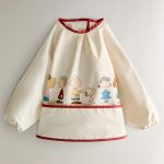 پیشبند نوزاد با طرح شخصیت Peanuts™، دارای لبههای رنگی متضاد، دکمههای چسبی در پشت، آستینهای بلند و روکش رزینی از جنس پنبه.
