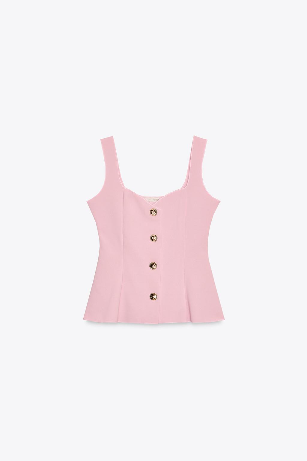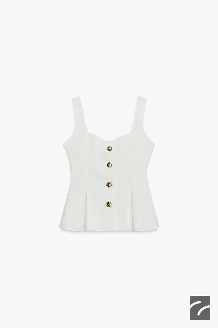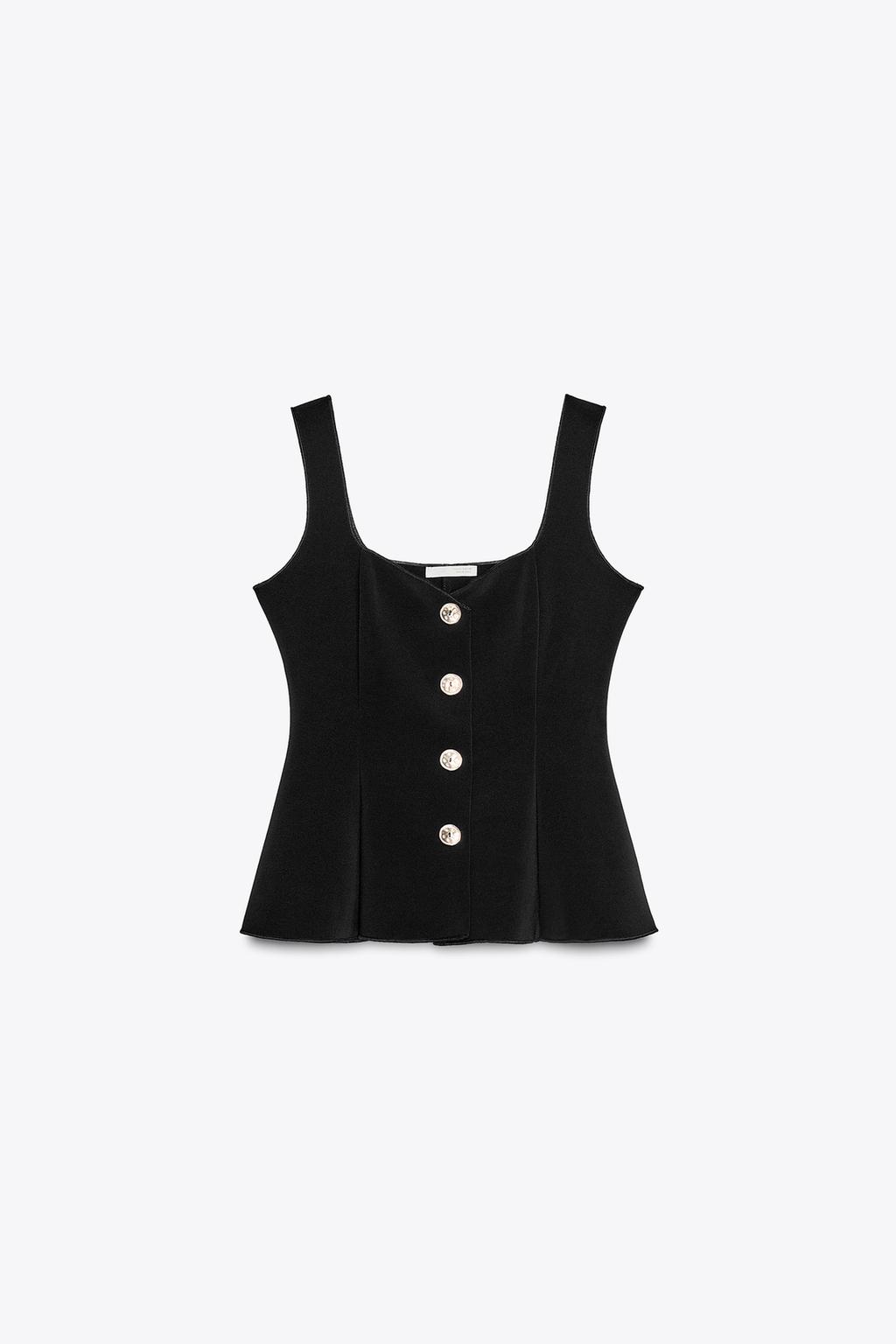 Triko kumaştan yapılmış yelek tipi üst. Kare yaka ve geniş askılı. Metal düğme detayı. Peplum detaylı etek ucu.