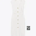 پیراهن میدی آستین کوتاه با یقه V و یقه پیراهن. دارای جزئیات چروک در کناره‌ها و بسته شدن جلو با دکمه‌های فلزی.
