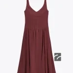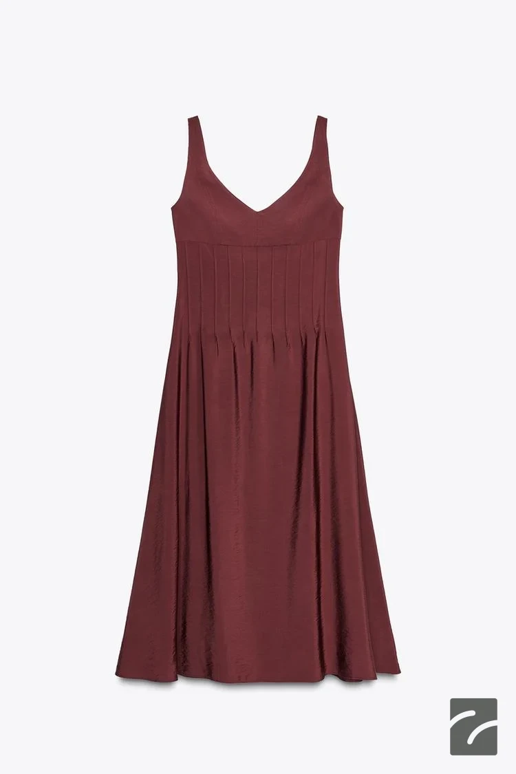 V yaka, geniş askılı elbise. Büzgülü, oturan belli. Arkası dikişe gizlenmiş fermuarlı.