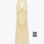 Poliamidden üretilmiş midi elbise. Bağcıklı halter yakalı. Derin V yakalı ve metal parça detaylı. Büzgülü kumaş.