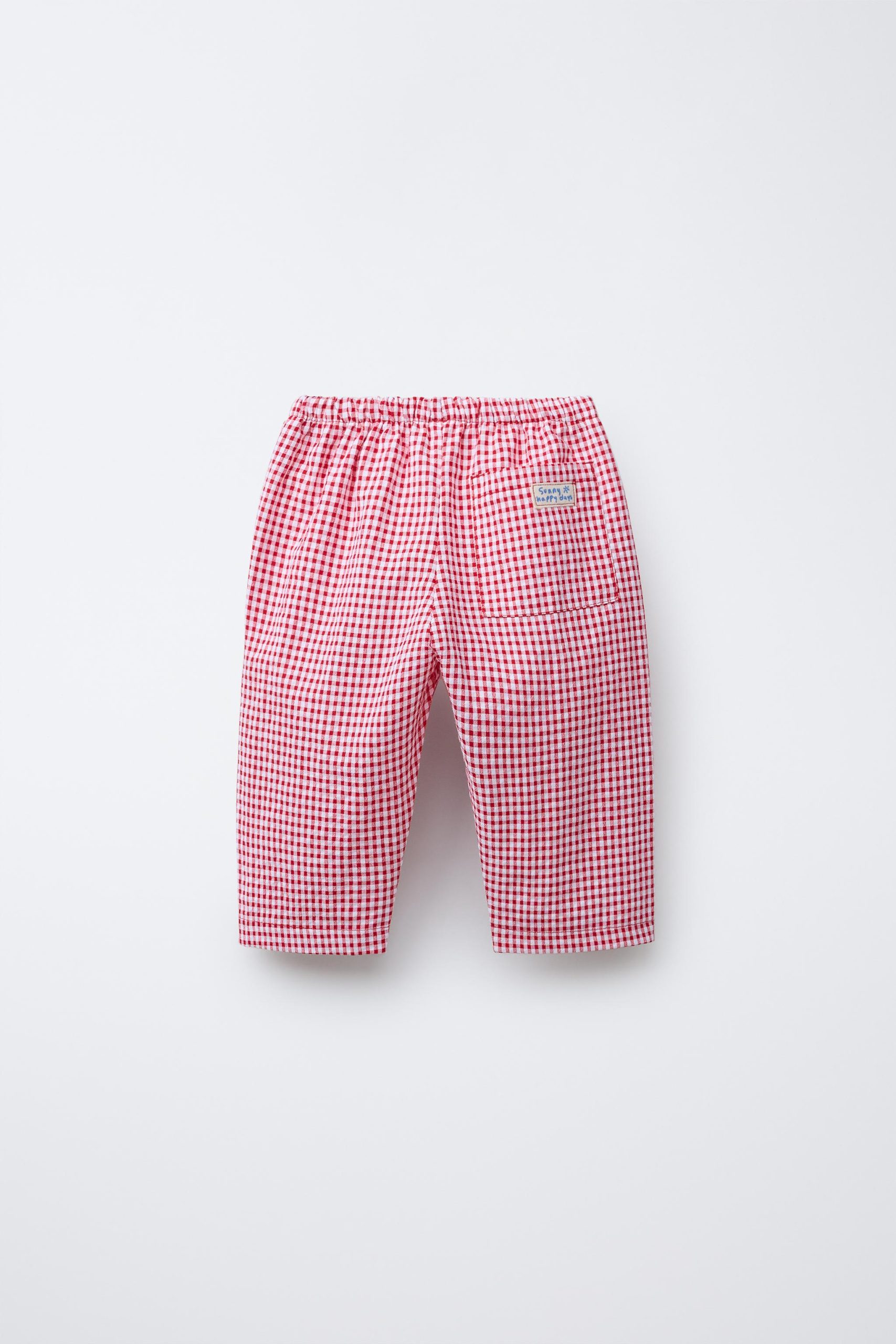 Elastik belli, bol kesim pantolon. Önü suni cepli, arkası etiket aplikeli yama cepli. Pötikareli.