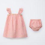 Bisiklet yaka ve fırfır aplikeli askılı elbise. Çiçek baskılı şerit detaylı. Pötikareli baskılı ve çiçek işlemeli detaylı. Lastikli belli külot. Pötikareli baskılı.