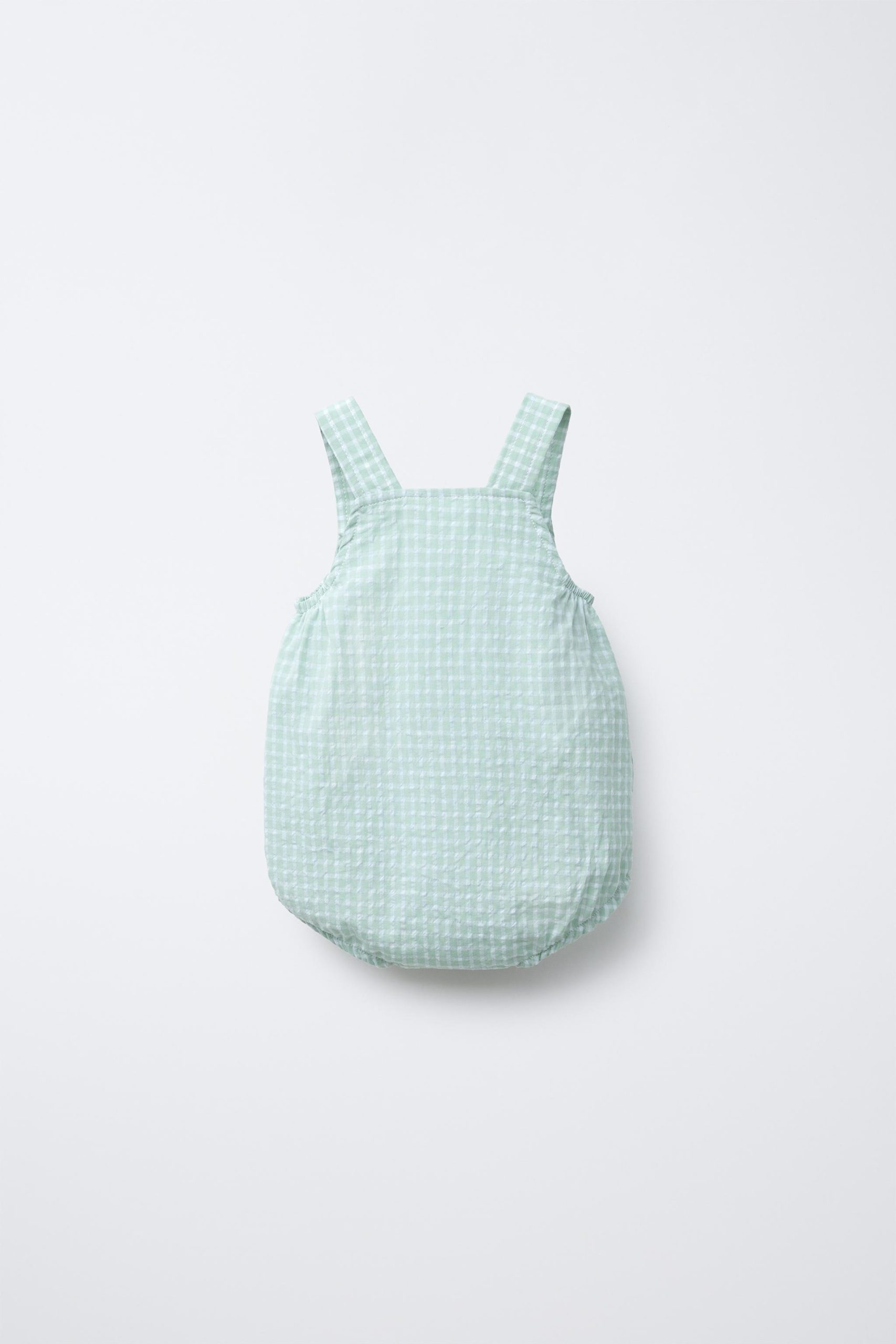 Düz yakalı ve önü düğme kapamalı askılı tulum. Alt kısmı çıtçıtlıdır. Ön tarafında yama cep bulunur. Pötikareli baskılı. %65 pamuklu kumaştan üretilmiştir.