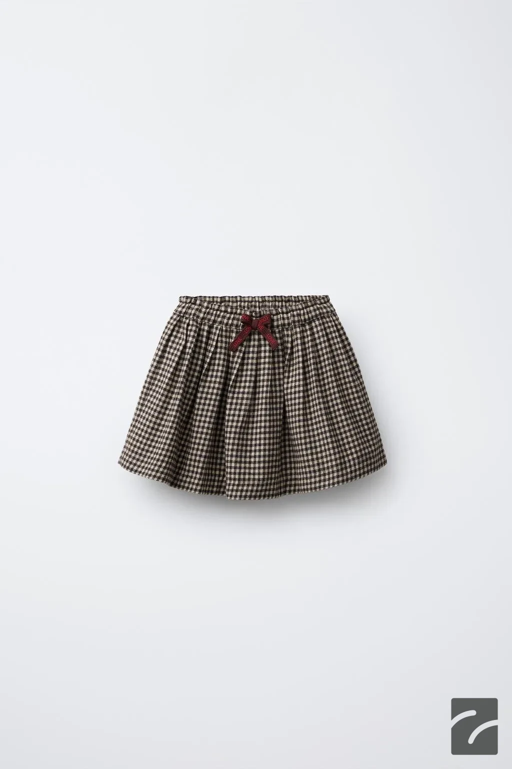 Elastik belli, önü fiyonk aplikeli, yumuşak etek. Pili detaylı ve pötikareli desene sahip.