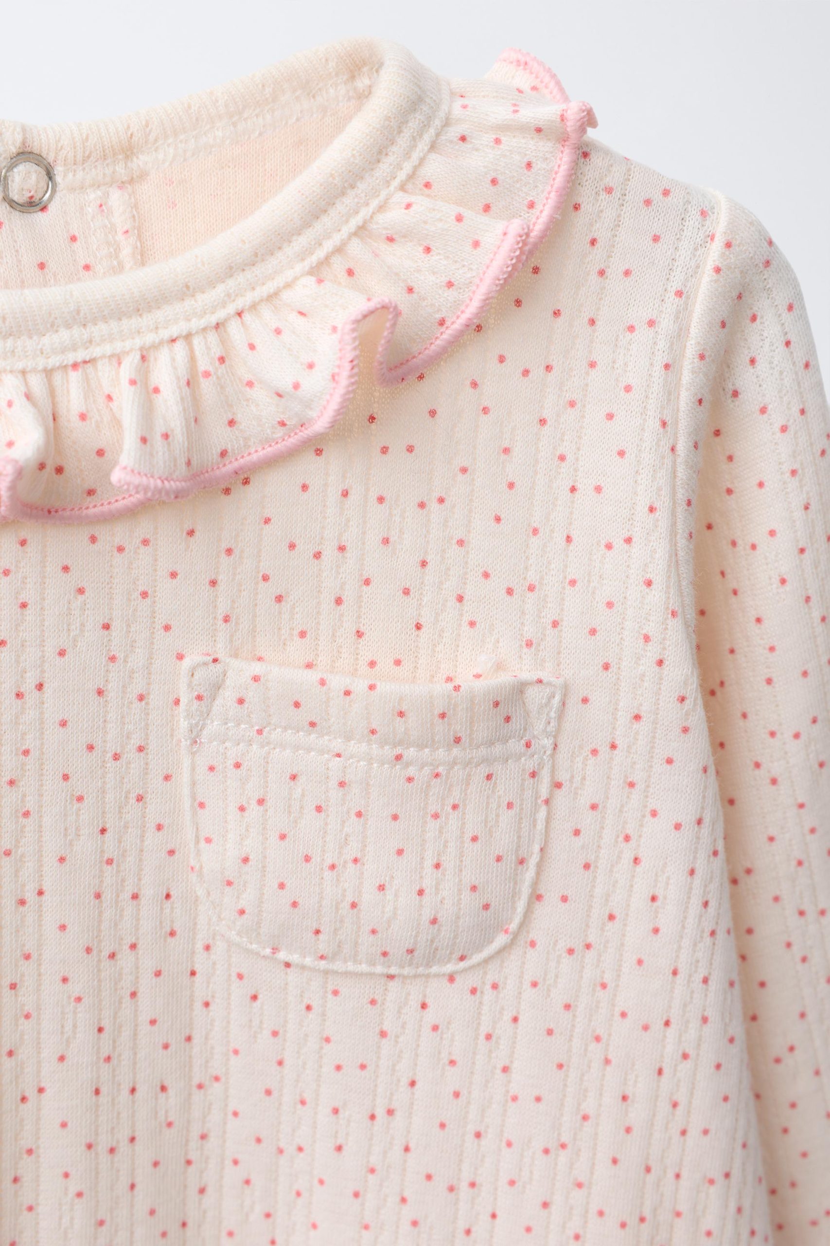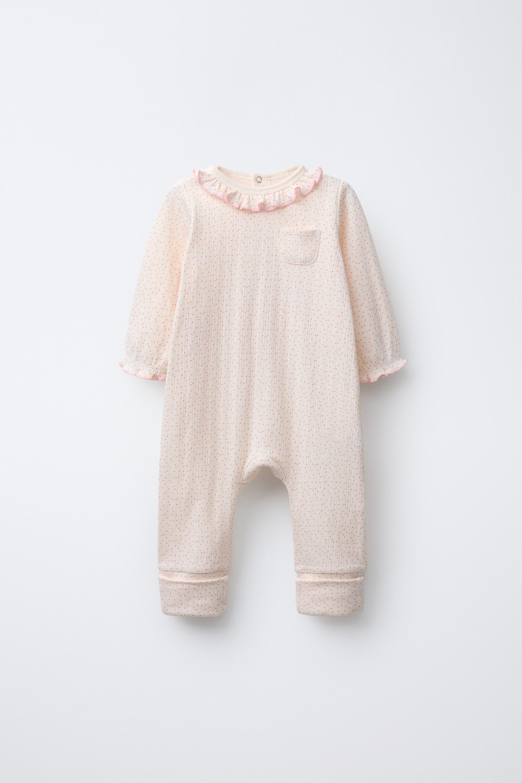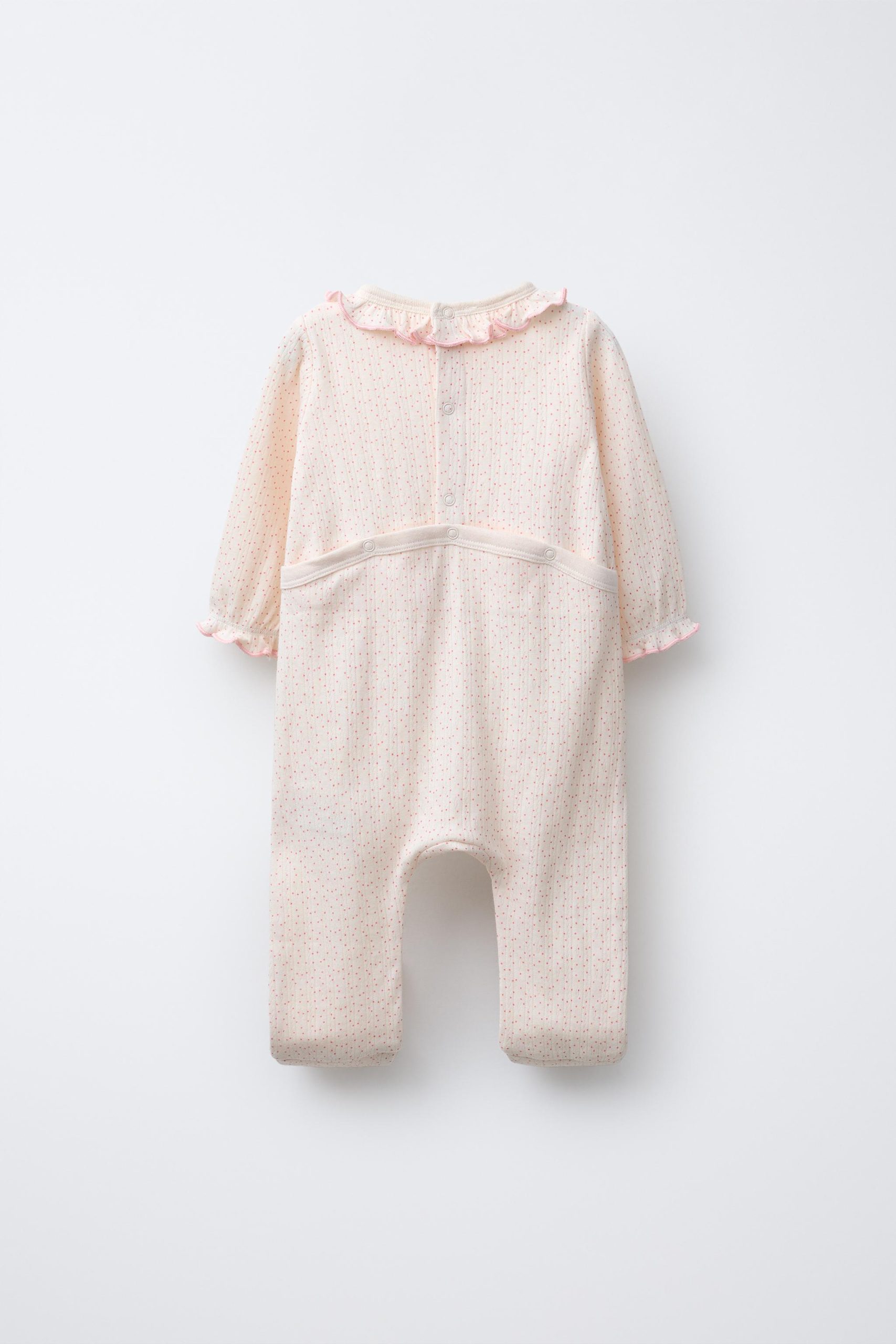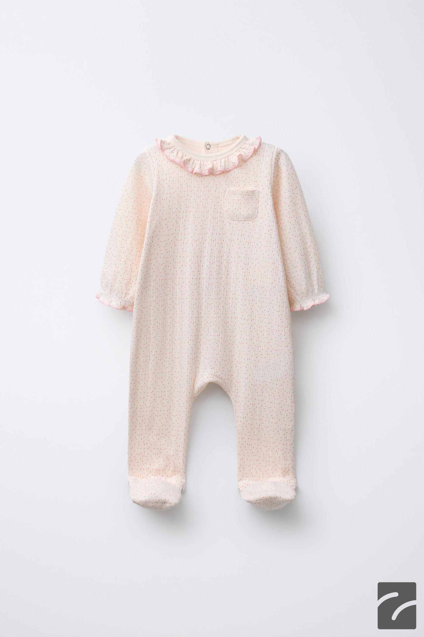 Bisiklet yaka, fırfır detaylı ve kıvrık manşetli uzun kollu pijama tulumu. Ayarlanabilir paça boyu sayesinde çoraplı pijama tulumuna dönüşebilir. Sırt ve bel kısmında çıtçıt düğmeli. Göğüs kısmında yama cep. Puantiye desenli. %100 pamuklu kumaş.