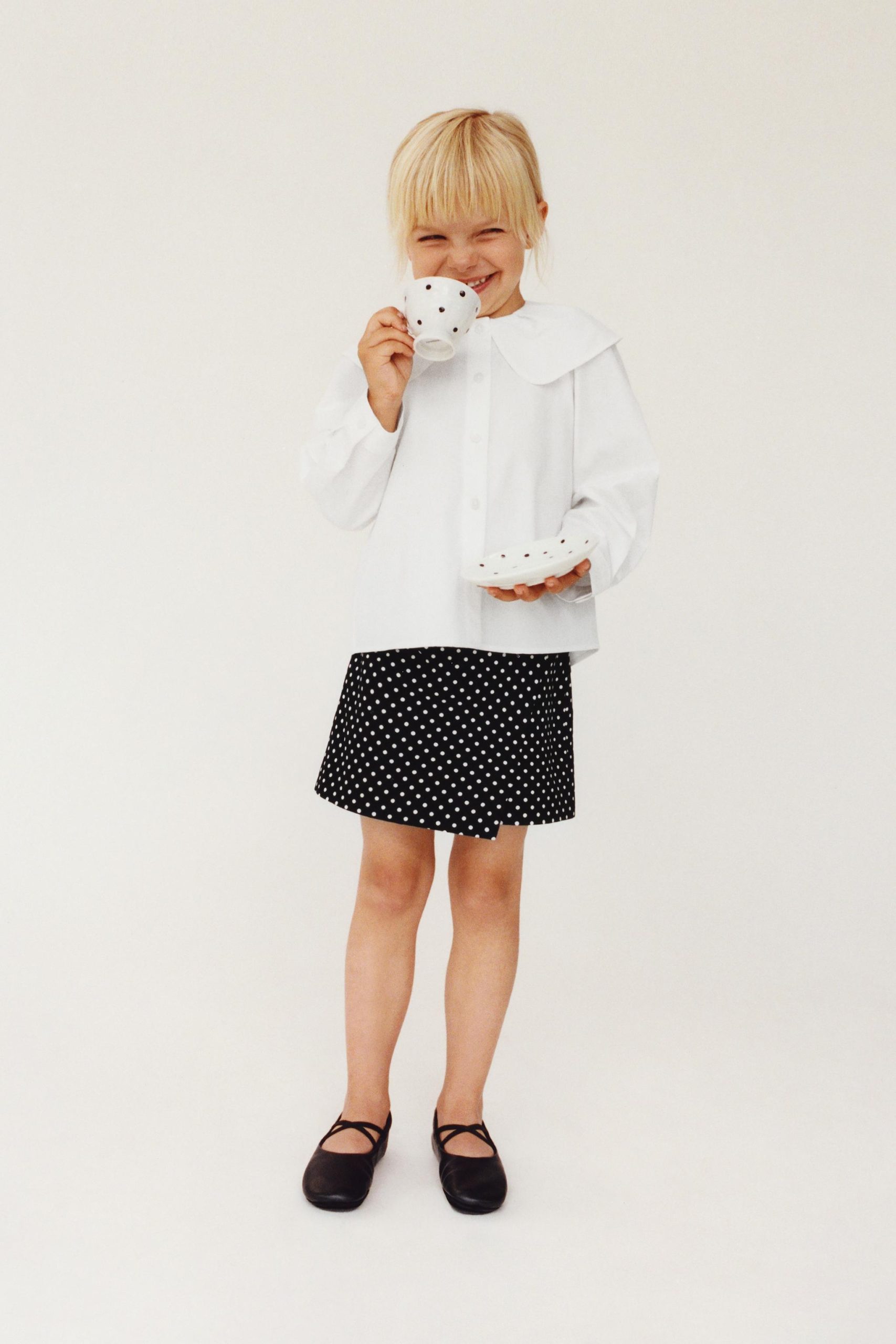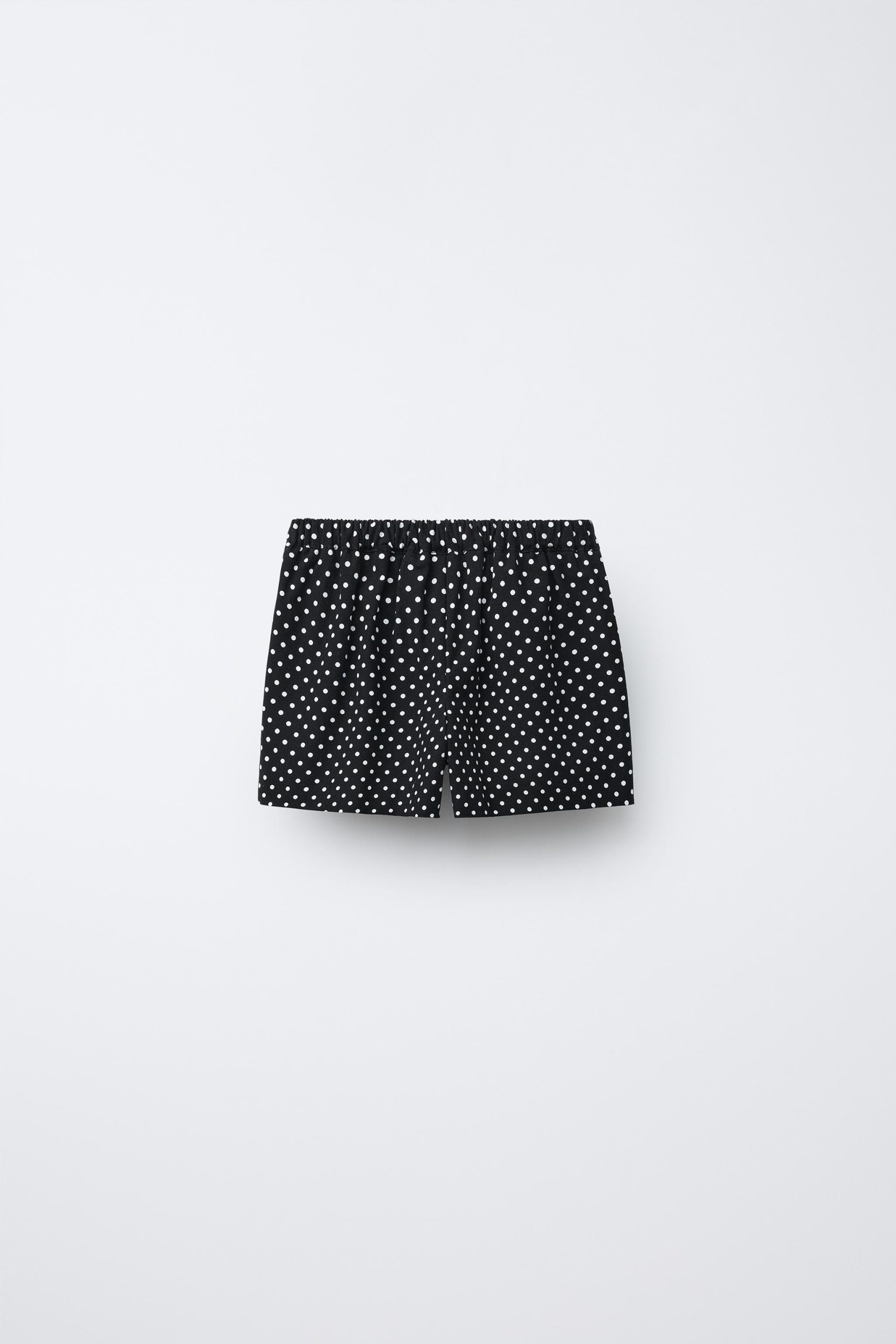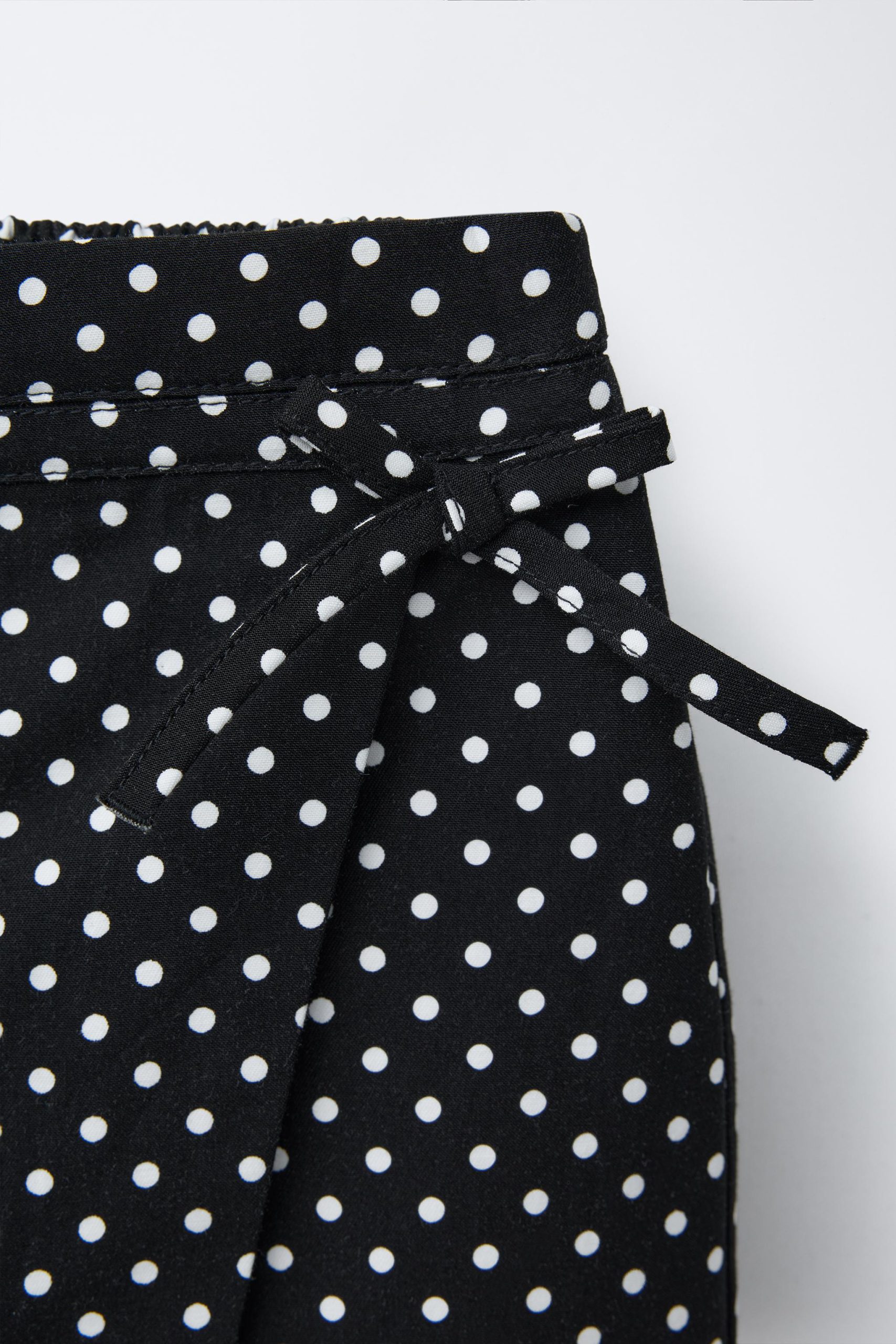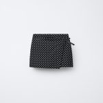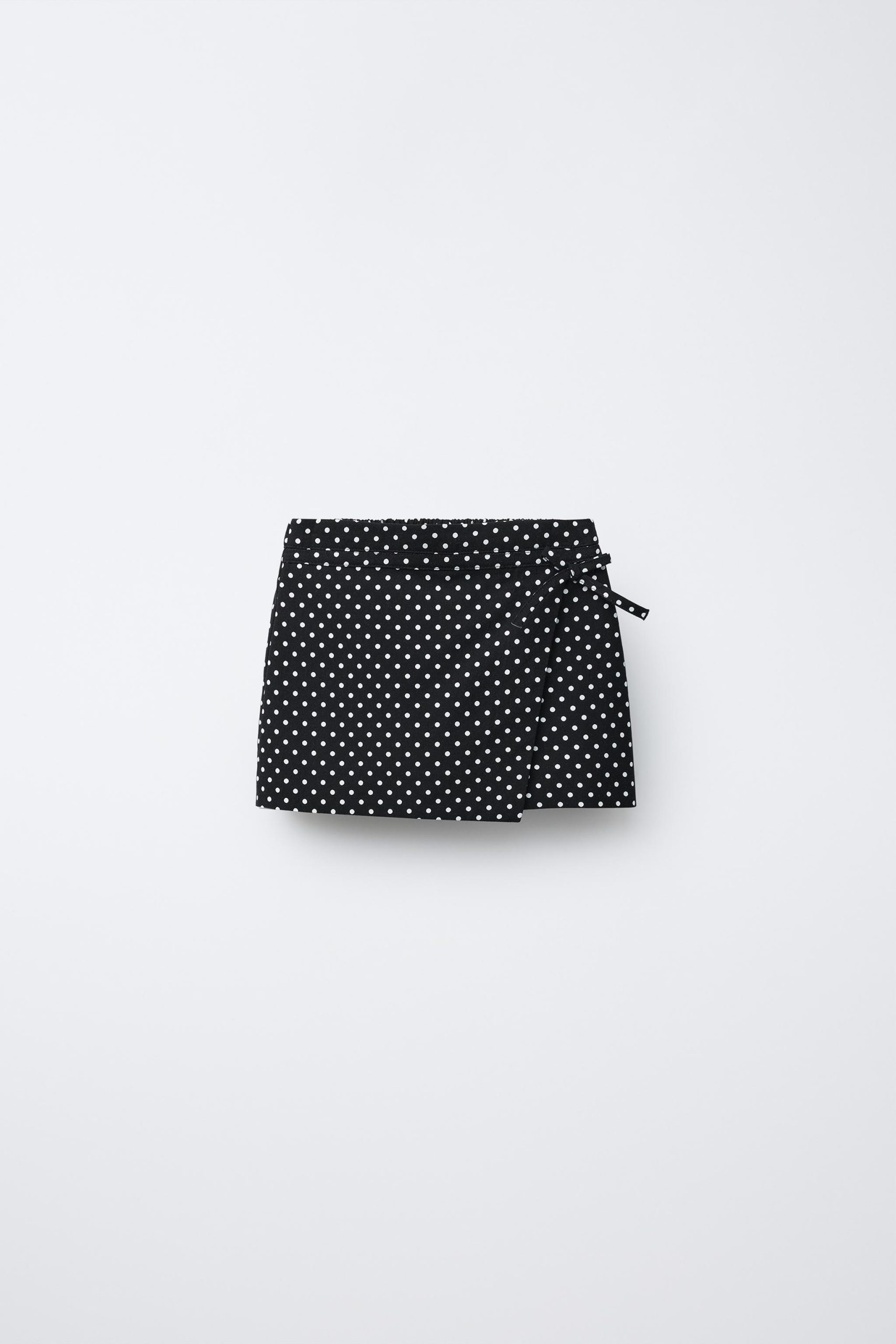 - Elastik belli, kruvaze kapamalı, kurdele aplikeli, bermuda şort etek. Puantiye baskılı.