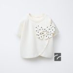 - Bisiklet yaka, kısa kollu t-shirt. Göğüs kısmında puantiyeli baskılı fiyonk aplikeli. %98 pamuklu kumaş.