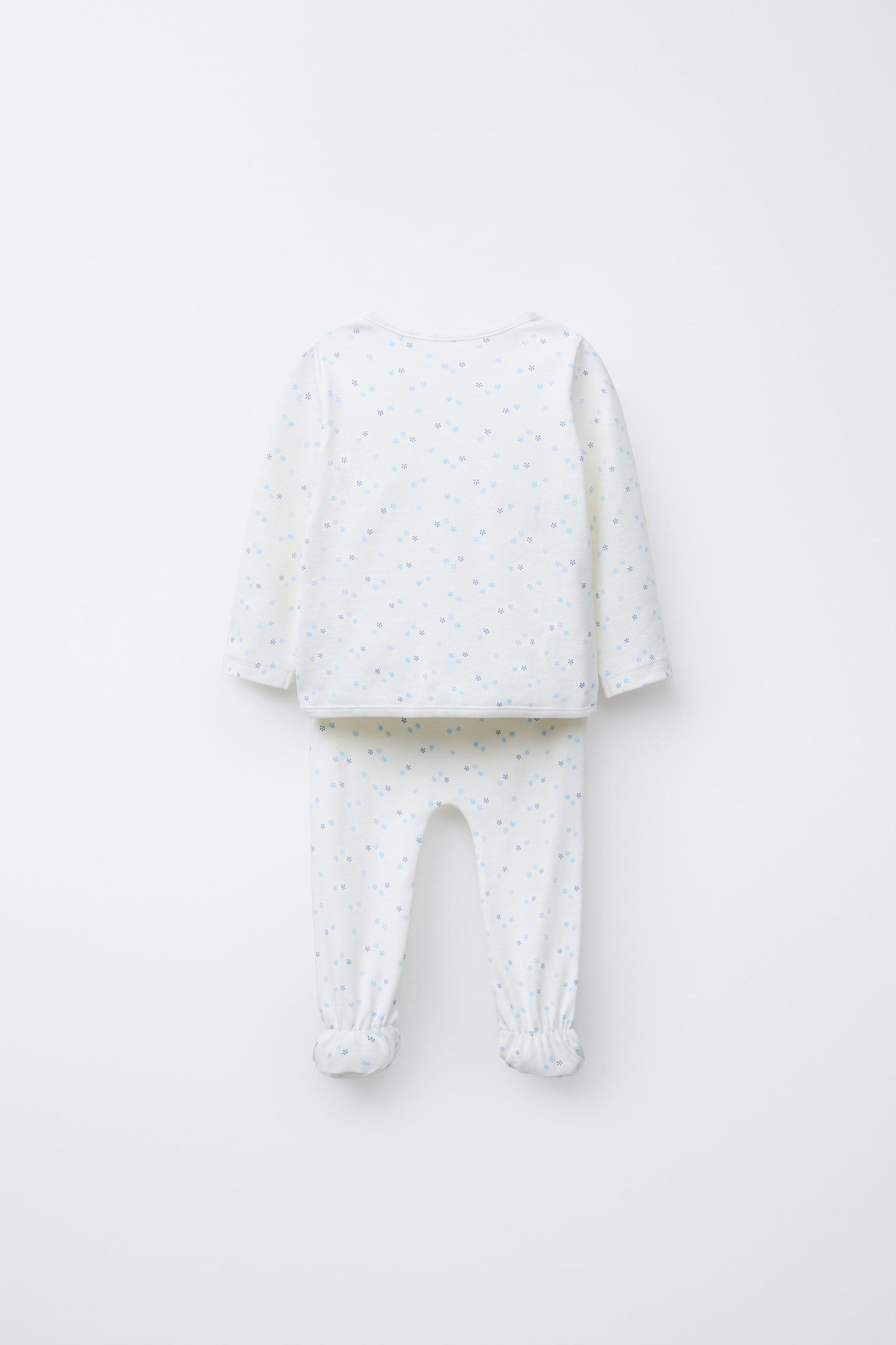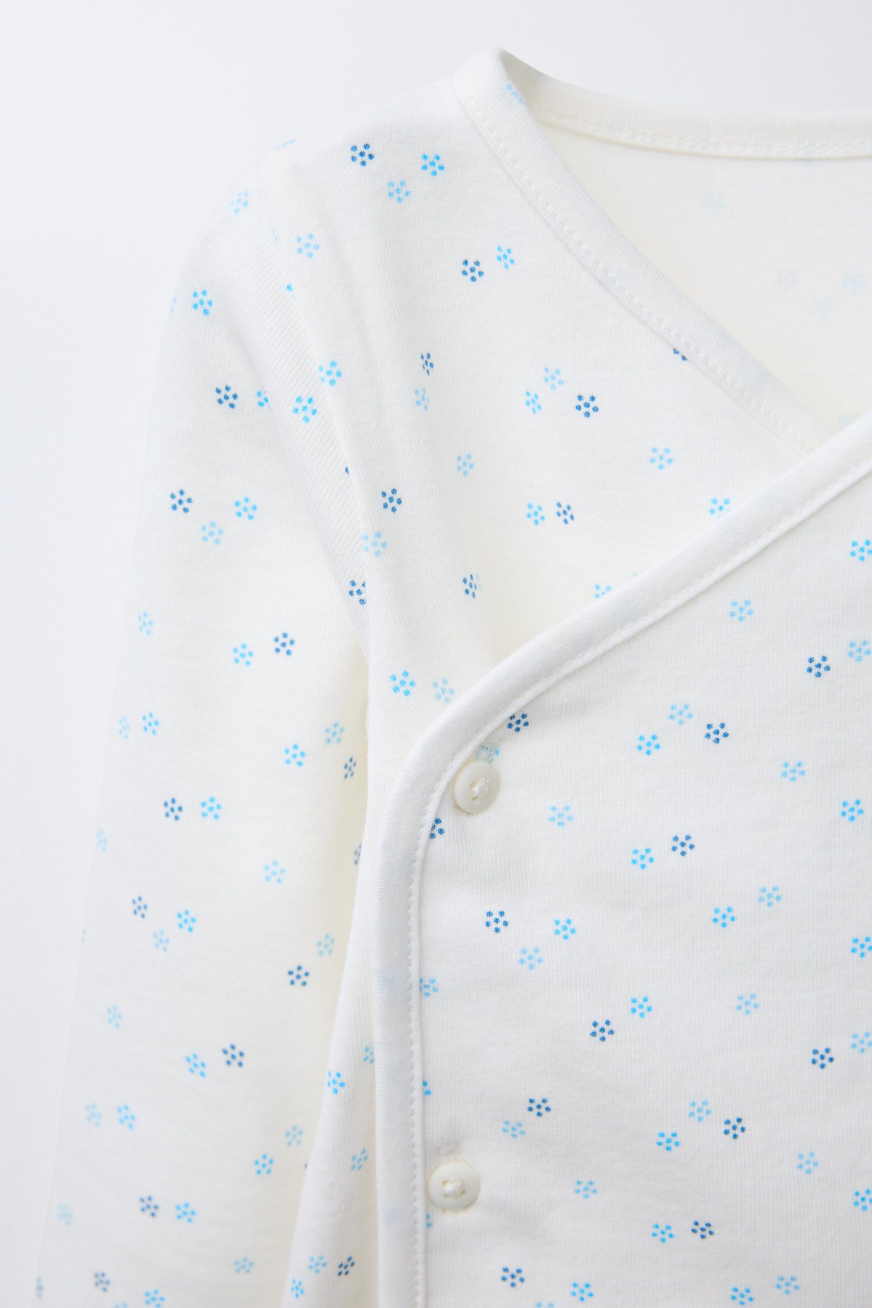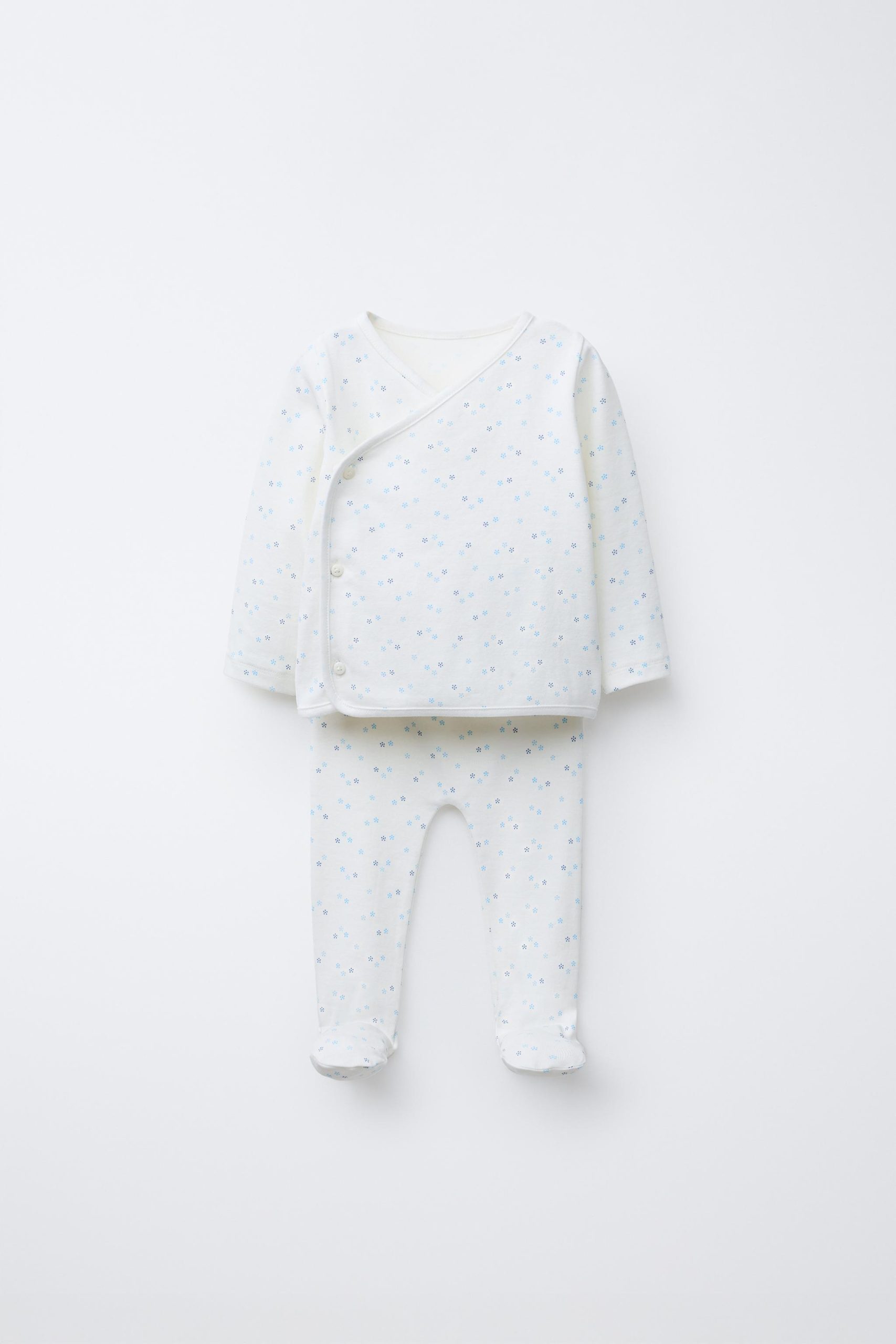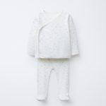 ست دو تکه. تیشرت یقه V و آستین بلند. بسته شدن دکمه‌ای به صورت مایل. پایان‌های زنده در رنگ‌های هماهنگ. شلوارک کشی با کمر الاستیک. پارچه با %10 پنبه.
