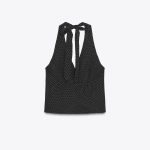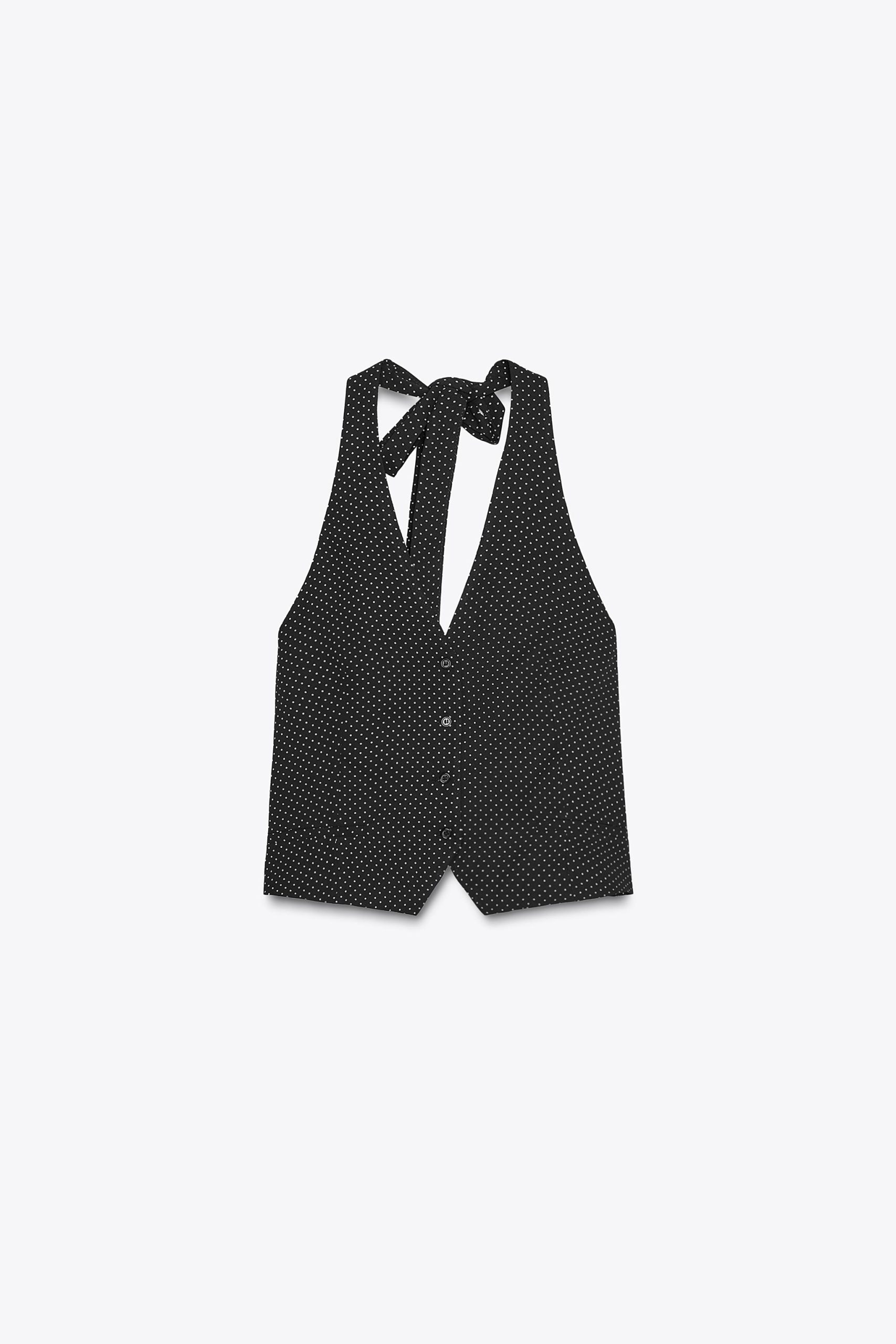 Halter yakalı, bağcıklı ve V yaka üst yelek. Önde biyeli cepler. İç astarı kombine edilmiştir. Önden düğmeli kapama.