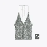 تاپ با یقه هالتر قابل تنظیم و بنددار. دارای جزئیات تزئینی با پولک. آستر داخلی از توری است.