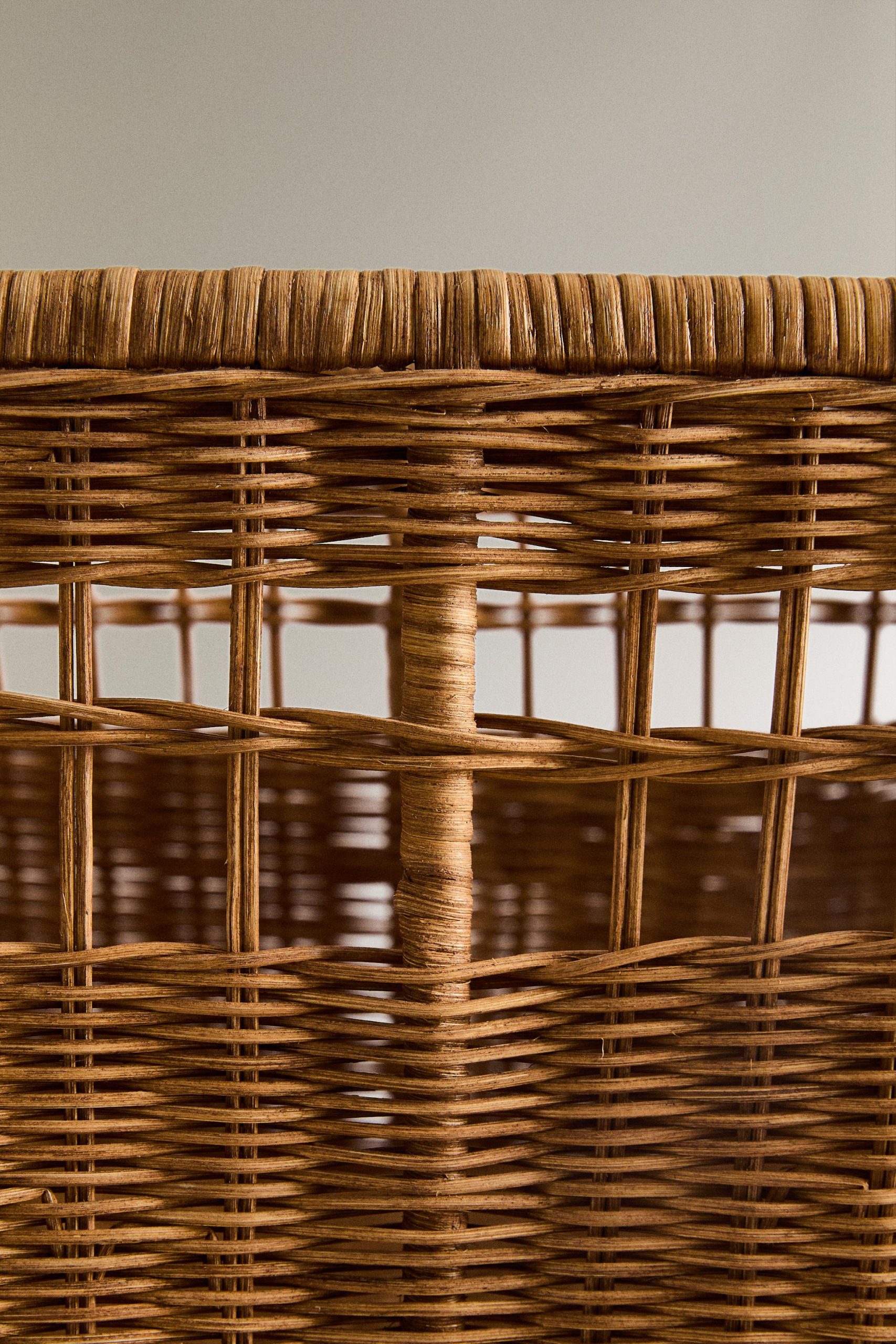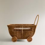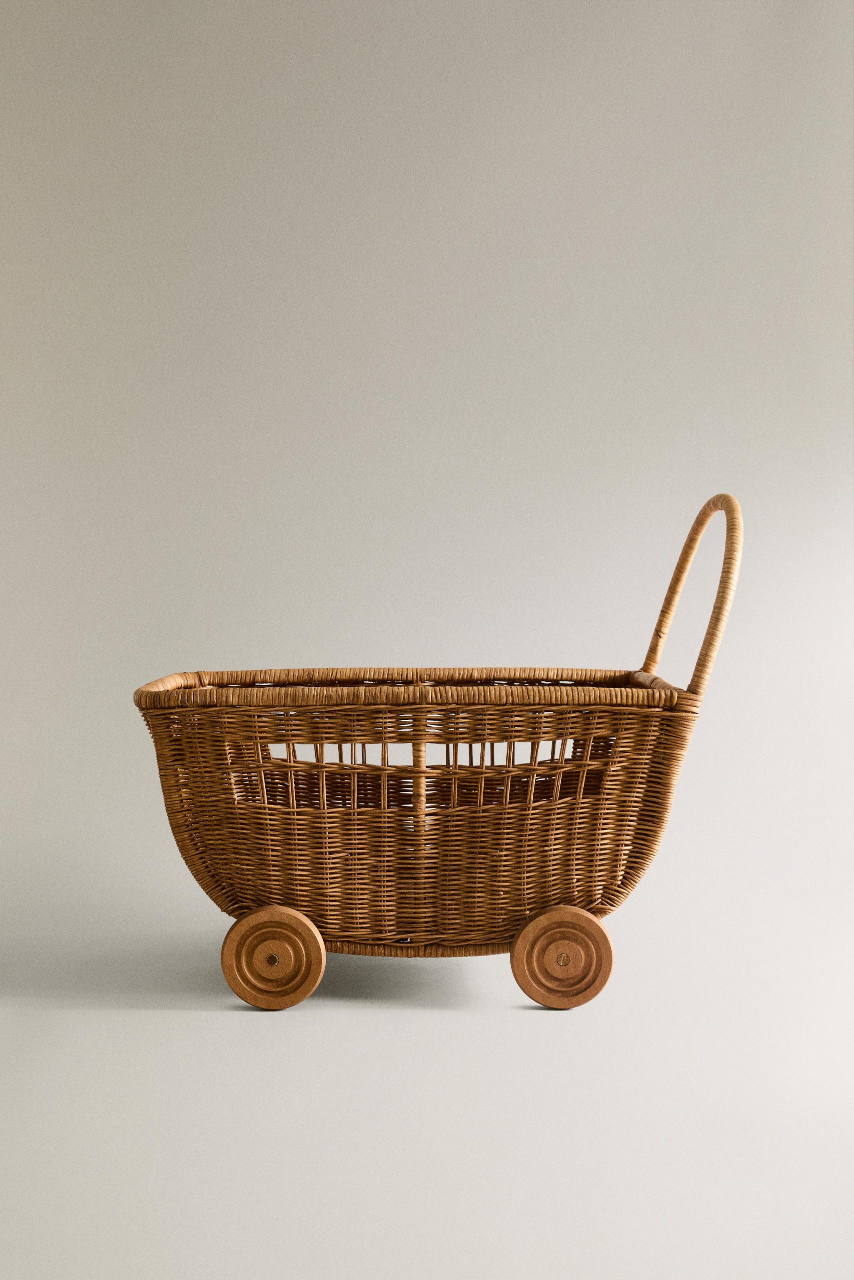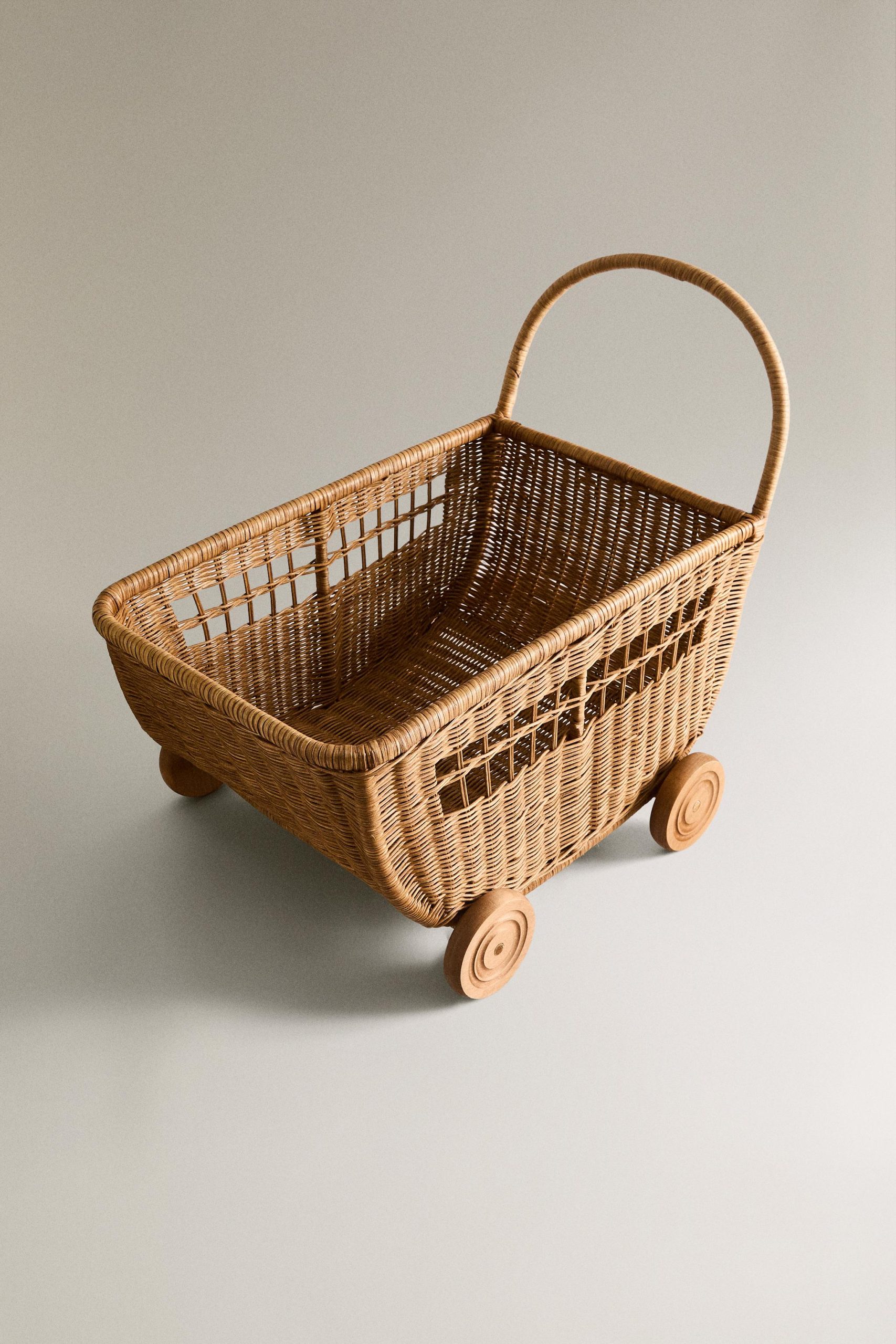 سبد سازماندهنده اسباببازی با چرخهای چوبی ثابت و بافت رتن برای کودکان.