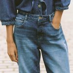 شلوار جین با کمر بلند و فیت راحت، دارای پنج جیب. پاچهها کمی چیندار و صاف هستند. جلوی شلوار با زیپ و دکمه بسته میشود.