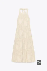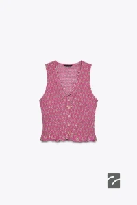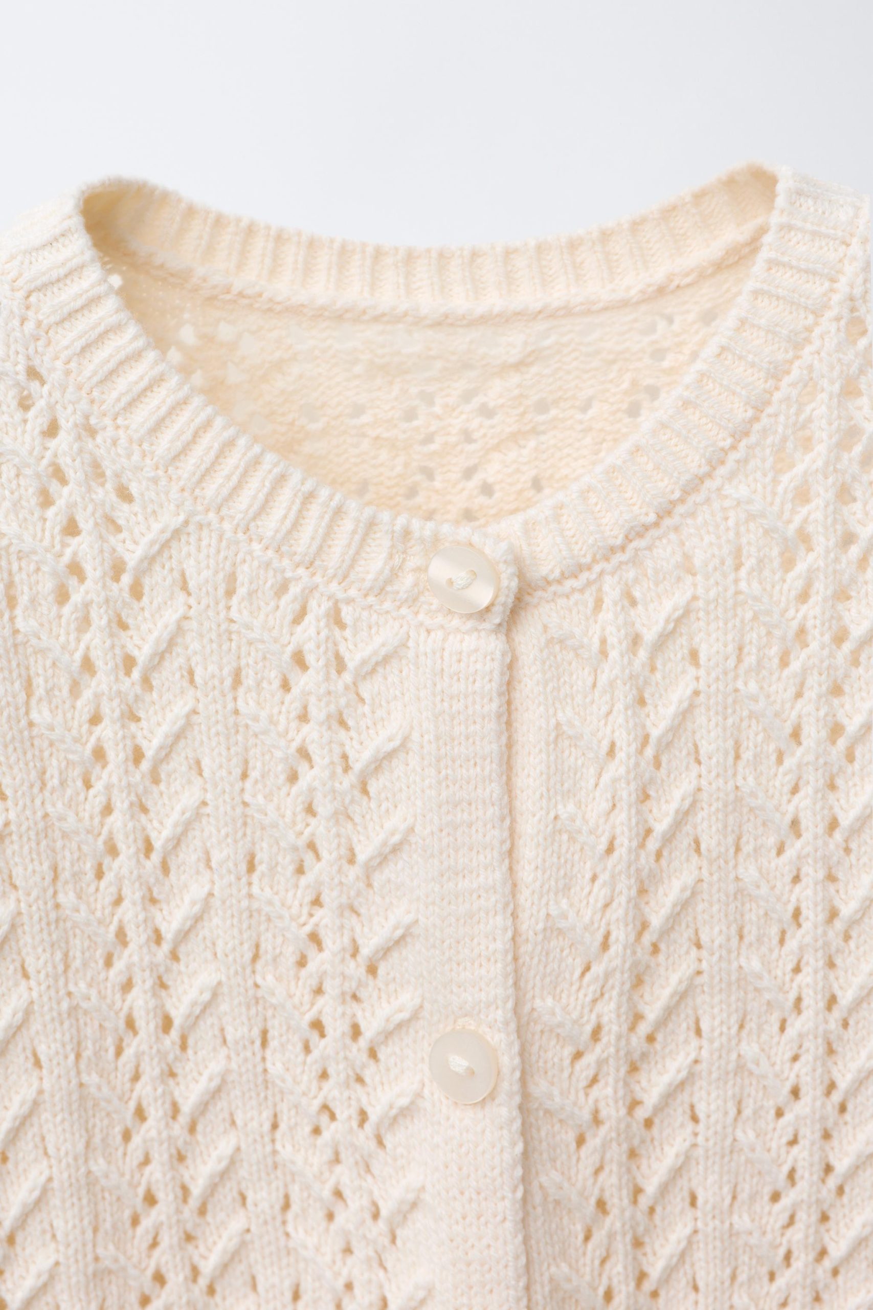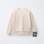هفتهای بافتنی با یقهی بیسیکلت و آستینهای بلند. دارای بسته شدن دکمهای در جلو. لبهی پایین با جزئیات دانتل تزئین شده است.