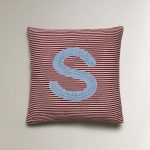 کوسن کودک با طراحی خطی و حروف “S” در وسط، از جنس پنبه و دارای پرشدگی است.