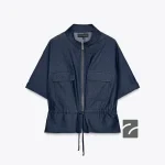 پیراهن کوتاه‌کلی با یقه ایستاده و آستین‌های چین‌دار. دارای کمربند قابل تنظیم و جیب جلو با درپوش. دارای زیپ در قسمت جلو.