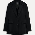- Saten kumaş blazer. Çentikli katlı yaka ve kabarık omuzlu uzun kollu. Püsküllü kenarlı. Önü düğmeli.
