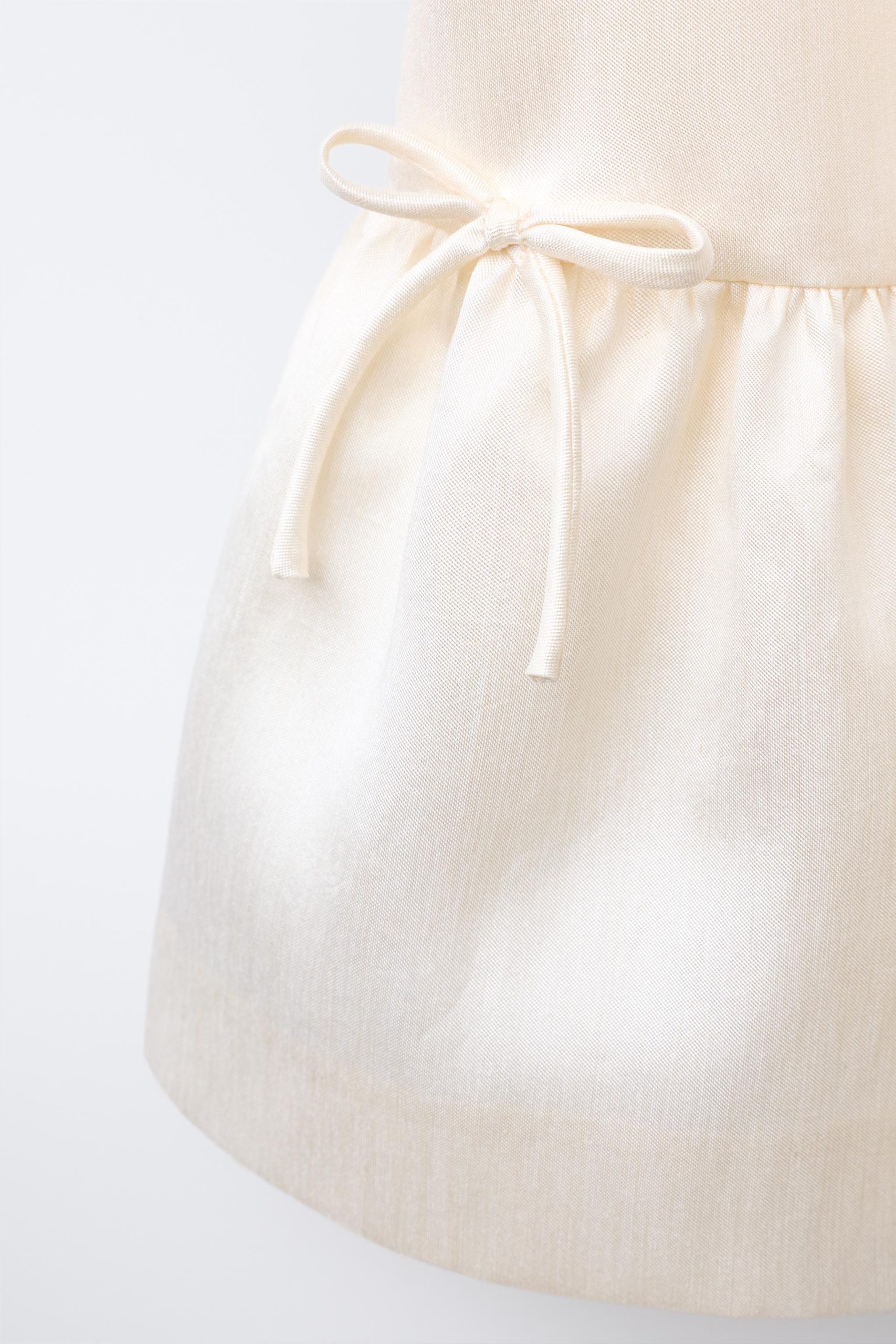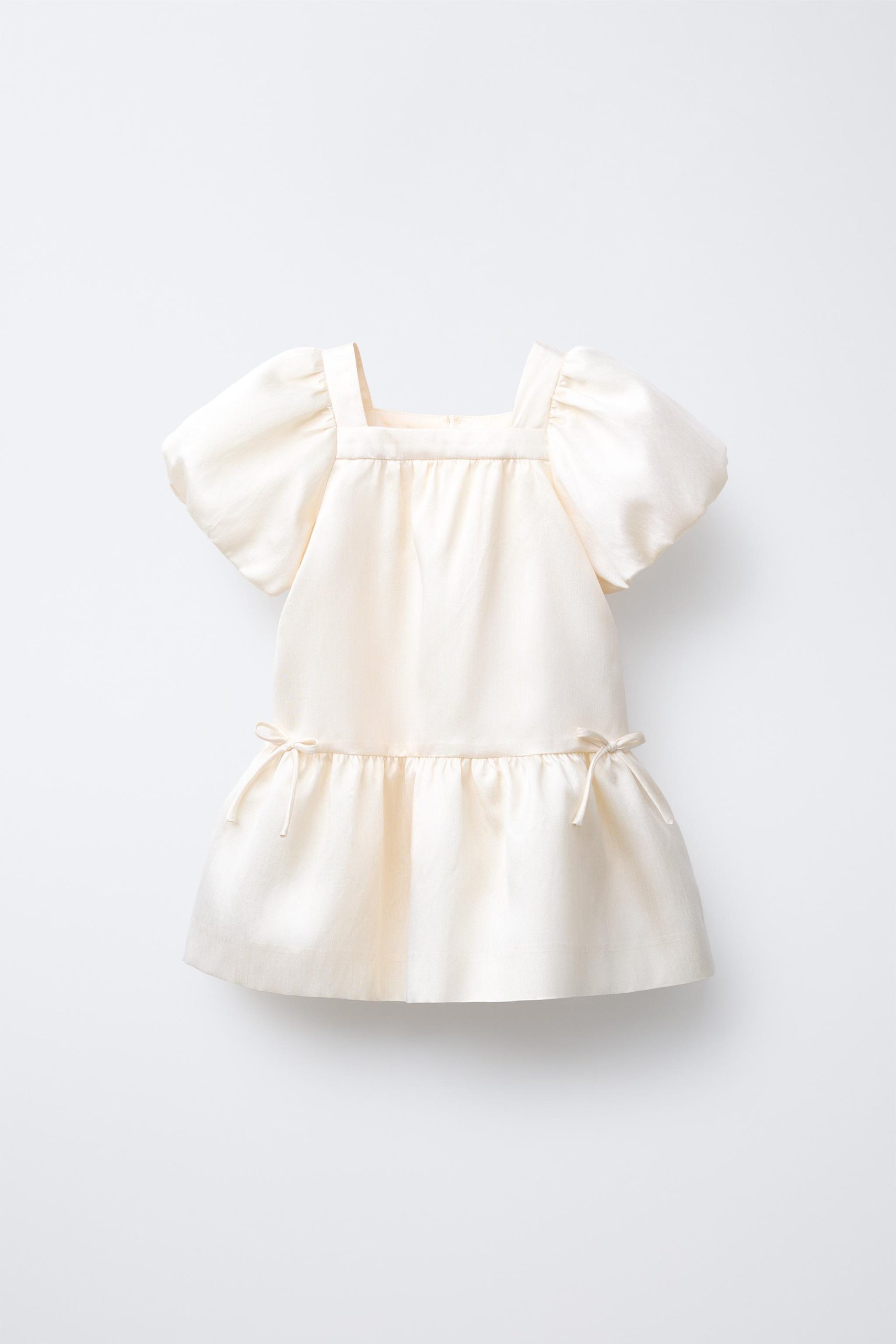 پیراهن کوتاه با یقه صاف و آستینهای بادکنکی کشباف. در قسمت پشت با دکمهای به شکل اشک بسته میشود. جلو با اپلیکیشن روبان تزئین شده و آستر داخلی آن هم رنگ هماهنگ دارد.