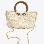 Sedef efektli apliklerle süslenmiş yarım ay şeklinde çanta. Çift yuvarlak tutma sapı ve çıkarılabilir zincir omuz askısı. Astarlı ve iç cebi mevcut. Mıknatıslı kapatma.